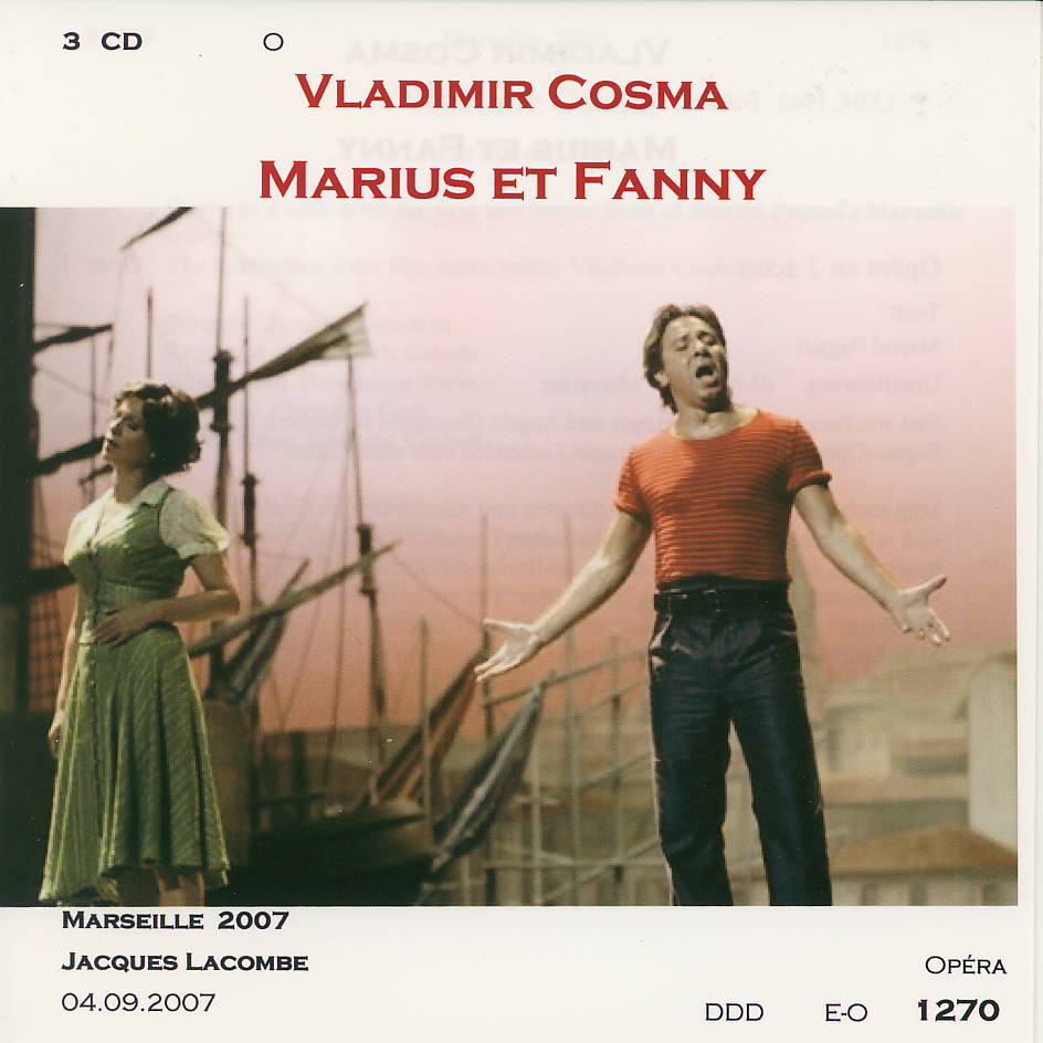 | 3 novembre Marius et Fanny de Cosma enregistré à l'Opéra de Marseille Vladimir Cosma Marius et Fanny Opéra en 2 actes, d'après les oeuvres de Marcel Pagnol Opera in 2 acts, after the first two books/ films of Marcel Pagnol's Marseille trilogy The first opera from film score writer Vladimir Cosma Dirigent Jacques Lacombe Regisseur Jean-Louis Grinda Bühnenbild Dominique Pichou Kostüme Christian Gasc Beleuchtung Roberto Venturi Marius: Roberto Alagna / Sébastien Guèze Fanny: Angela Gheorghiu / Karen Vourch César: Jean-Philippe Lafont Panisse: Marc Barrard Escartefigue: Eric Huchet Honorine: Michèle Lagrange Monsieur Brun: Bruno Comparetti La Malaise: Li Chin Huang Piquoiseau: Antoine Garcin (Weltpremiere 4.9.2007) |