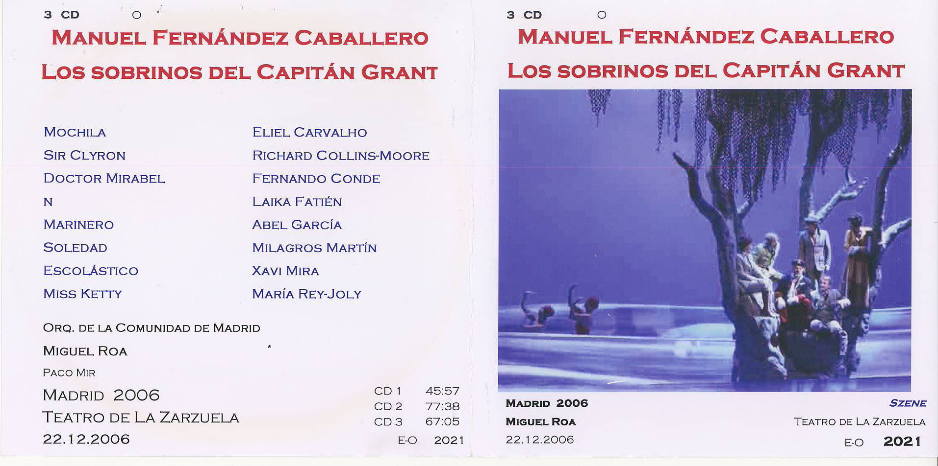 | Temporada del Teatro de La Zarzuela de Madrid Transmisión directa (José Iges) FERNÁNDEZ CABALLERO: Los sobrinos del Capitán Grant Eliel Carvalho, Richard Collins-Moore, Fernando Conde, Laika Fatién, Abel García, Milagros Martín, Xavi Mira, María Rey-Joly and Millán Salcedo. Coro del Teatro de La Zarzuela. Orq. de la Comunidad de Madrid. Musical direction by Miguel Roa. |