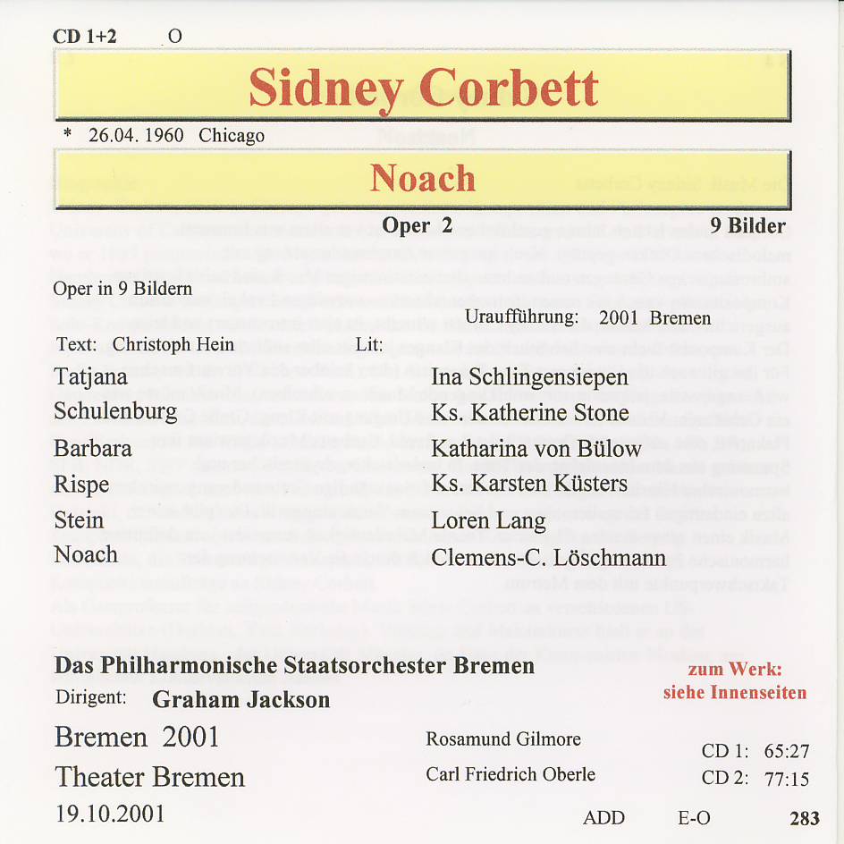 | NOACH Das Philharmonische Staatsorchester Bremen Cond. Graham Jackson. Cast: Tatjana - Ina Schlingensiepen Schulenburg - Ks. Katherine Stone Barbara - Katharina von Bülow Rispe - Ks. Karsten Küsters Stein - Loren Lang Noach - Clemens-C. Löschmann - - |