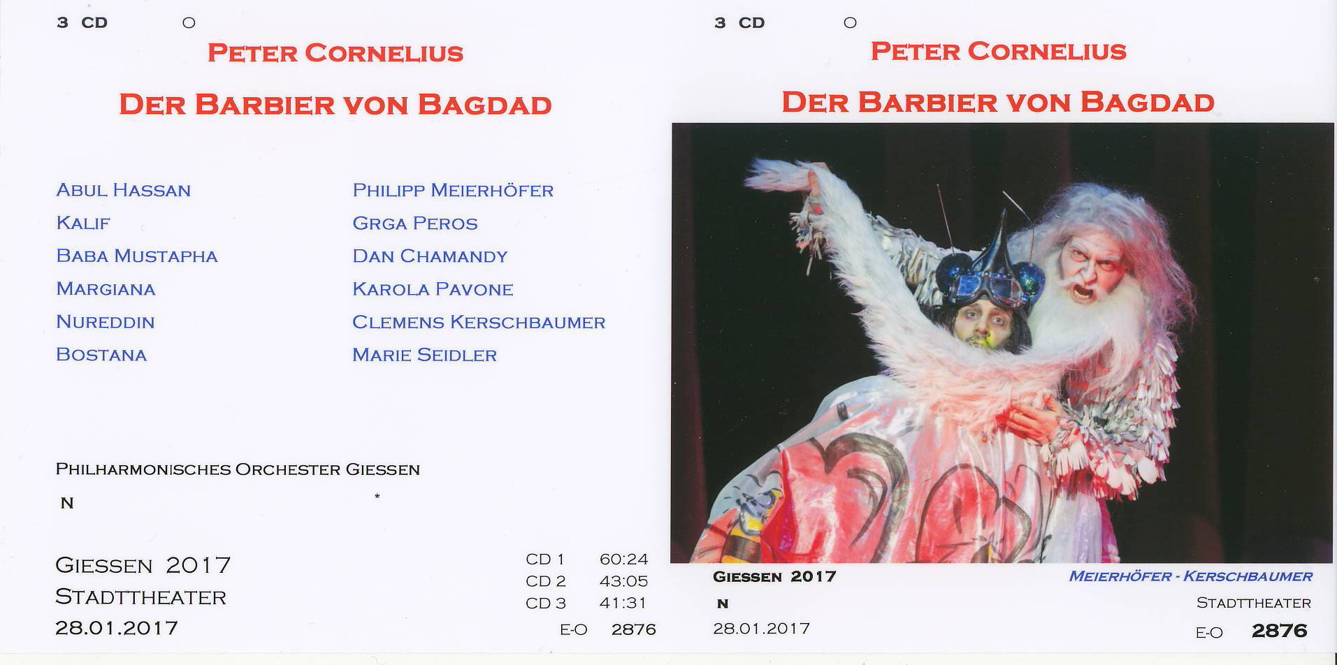 | DER BARBIER VON BAGDAD Philharmonisches Orchester Gießen Cond. Jan Hoffmann. Cast: Abul Hassan - Philipp Meierhöfer Kalif - Grga Peros Baba Mustapha - Dan Chamandy Margiana - Karola Pavone Nureddin - Clemens Kerschbaumer Bostana - Marie Seidler - - |