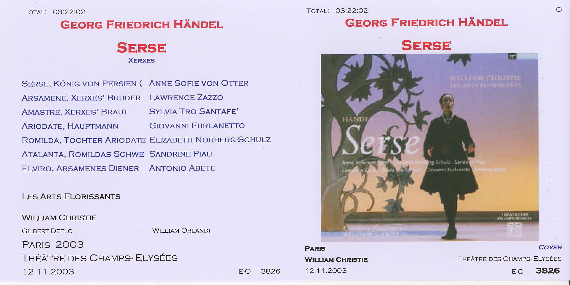 | IDOMÉNÉE Les Arts Florissants Cond. William Christie. Cast: Venus - Maria Boyer Äolus - Jérome Corréas Nemesis - Jérome Corréas Proteus - Jean-Claude Sarragosse Idomeneus - Bernard Deletré Idamantes - Jean-Paul Fouchécourt Ilia - Monique Zanetti Elektra - Sandrine Piau |
