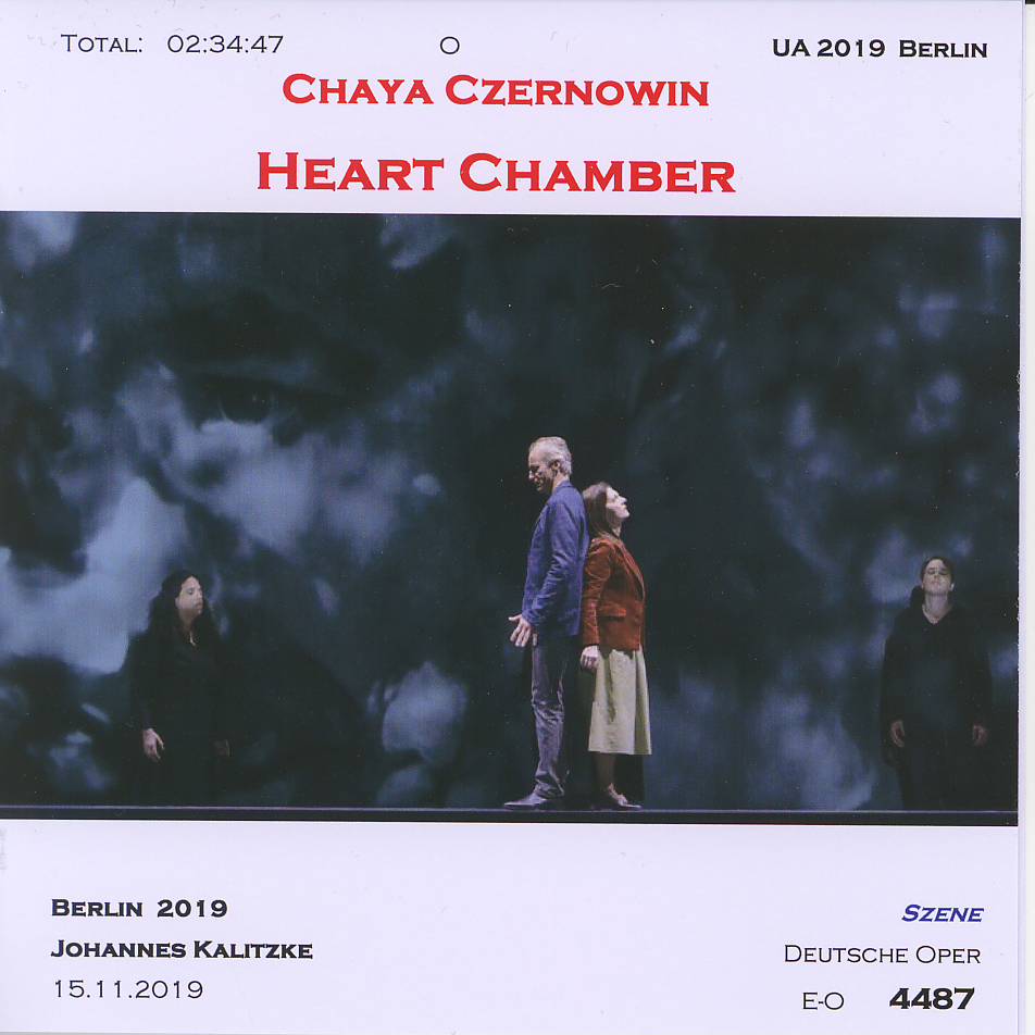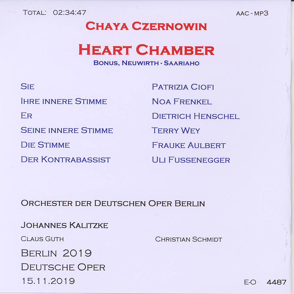 | HEART CHAMBER Orchester der Deutschen Oper Berlin Cond. Johannes Kalitzke. Cast: Sie - Patrizia Ciofi Ihre innere Stimme - Noa Frenkel Er - Dietrich Henschel Seine innere Stimme - Terry Wey Die Stimme - Frauke Aulbert Der Kontrabassist - Uli Fussenegger - - |
