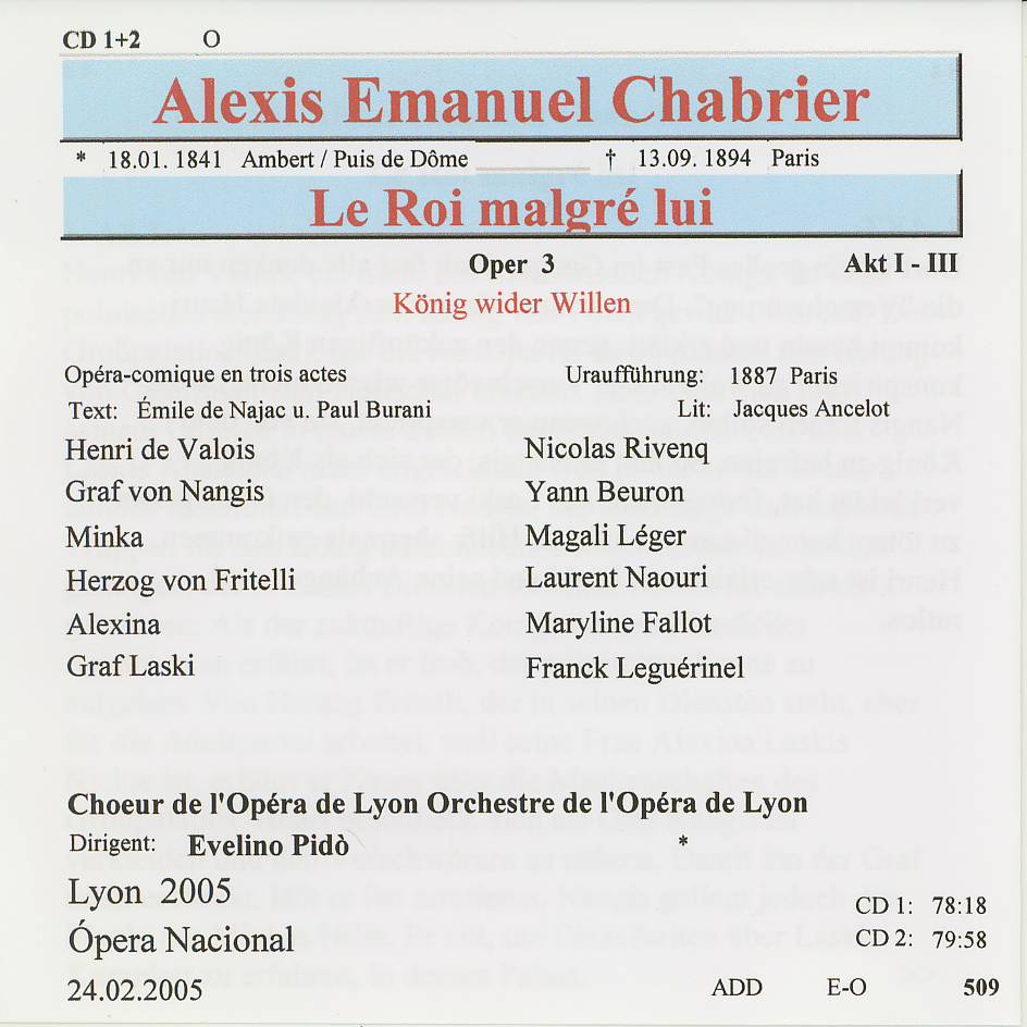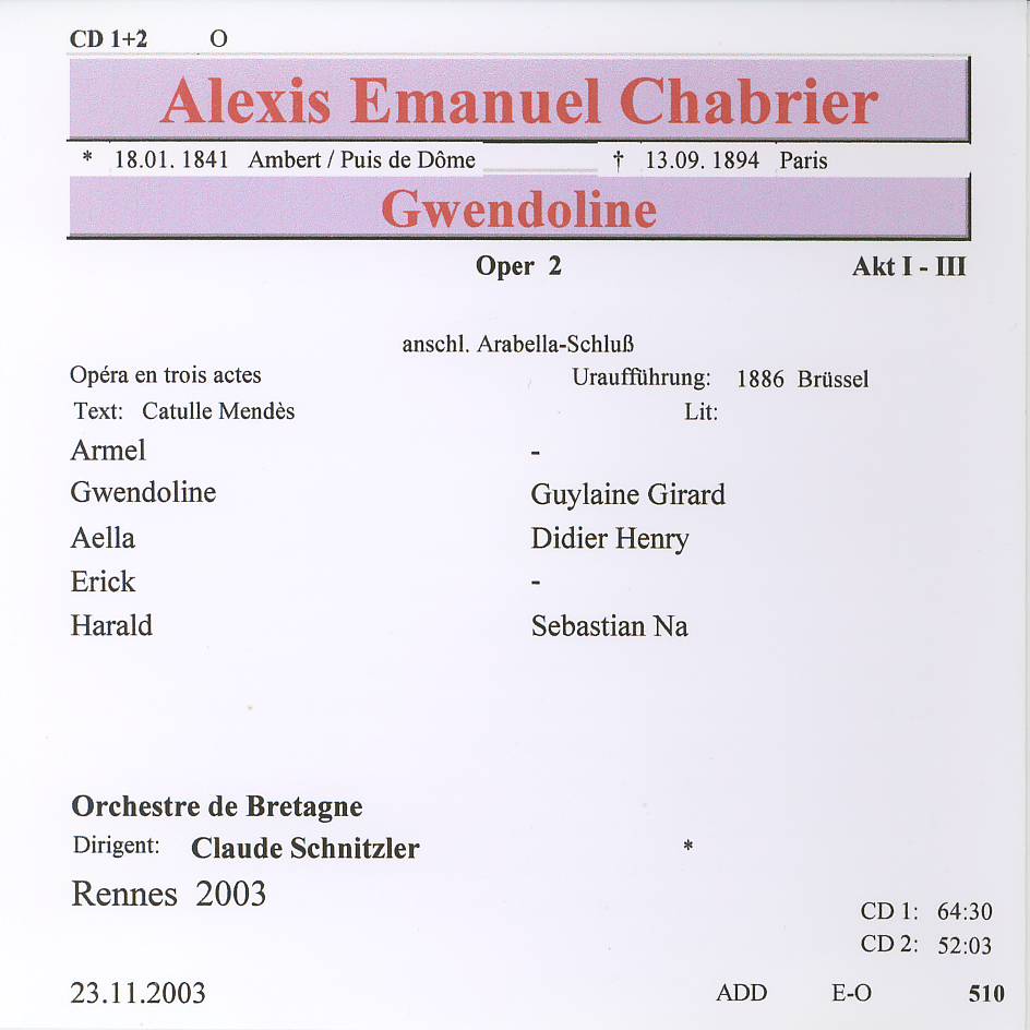 | DER CID Rundfunk-Sinfonieorchester Berlin Cond. Gustav Kuhn. Cast: Chimene - Gertrud Ottental Ruy Diaz - Ronnie Johansen Alvar Fanez - Endrik Wottrich König Fernando - Robert Schunk Graf von Vibar - Albert Dohmen Ein Herold - Michael Schopper Bote/Alkalde - Georg Taube - |