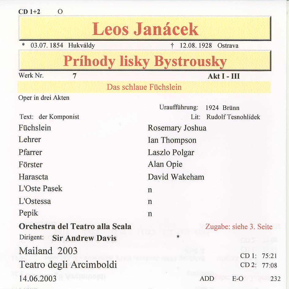 | OSUD Staatsorchester Stuttgart Cond. Silvain Cambreling. Cast: Zivný - John Graham-Hall Mila Málková - Rebecca von Lipinski Milas Mutter - Rosalind Plowrigth Dr. Suda - Heinz Göhrig Lhotský - Karl-Friedrich Dürr Konecný - Michael Ebbecke Frl. Stuhlá - Helene Schneiderman - |