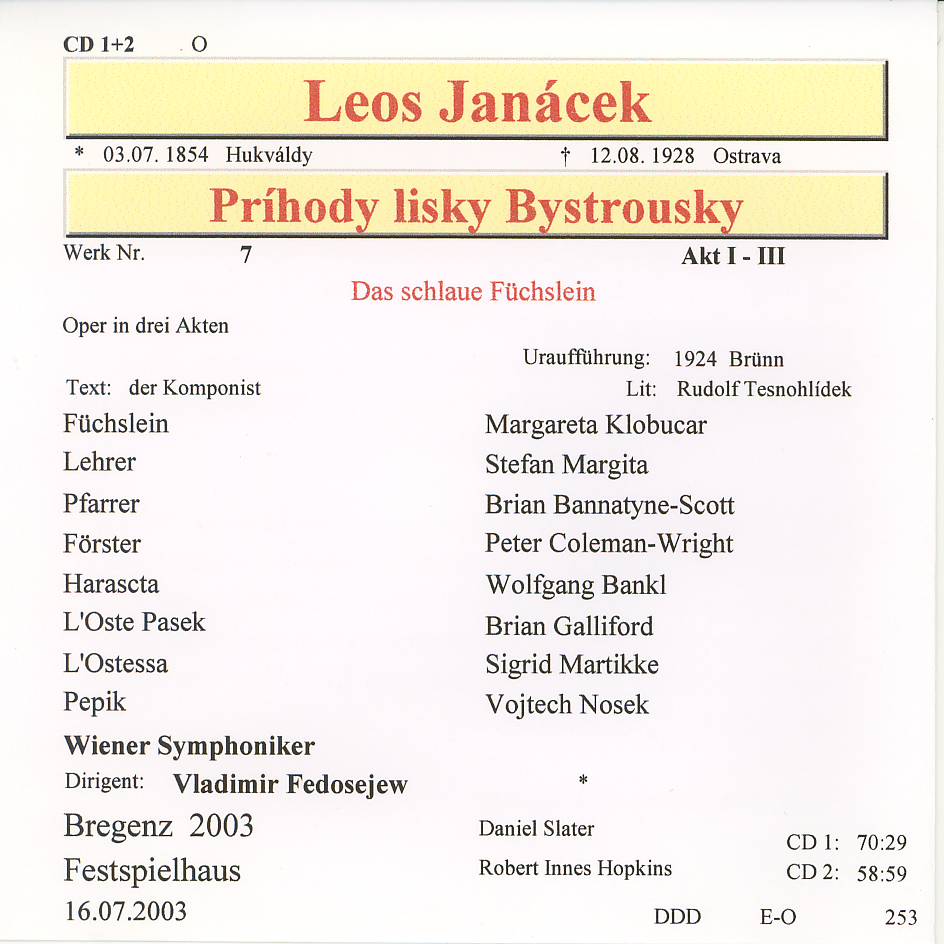 | Leos Janácek "Aus einem Totenhaus" Oper in 3 Akten Alexander Gorjantschikow: Dalibor Jedlicka Aljeja: Jaroslava Janská Filka Morosow: Jirí Zahradnícek großer Sträfling: Vladimir Krejcik kleiner Sträfling: Richard Novák Platzkommandant: Antonín Svorc ganz alter Sträfling: Beno Blachut Skuratow: Ivo Zidek Cekunow: Zdenék Sousek Sträfling in der Rolle Don Juans: Zdenék Sousek Wiener Staatsopernchor Wiener Philharmoniker Leitung: Charles Mackerras Leos Janácek: "Auf verwachsenem Pfade" Emma Schmidt (Klavier) Leos Janácek: Streichquartett Nr. 1 "Kreutzersonate" New Helsinki Quartet |