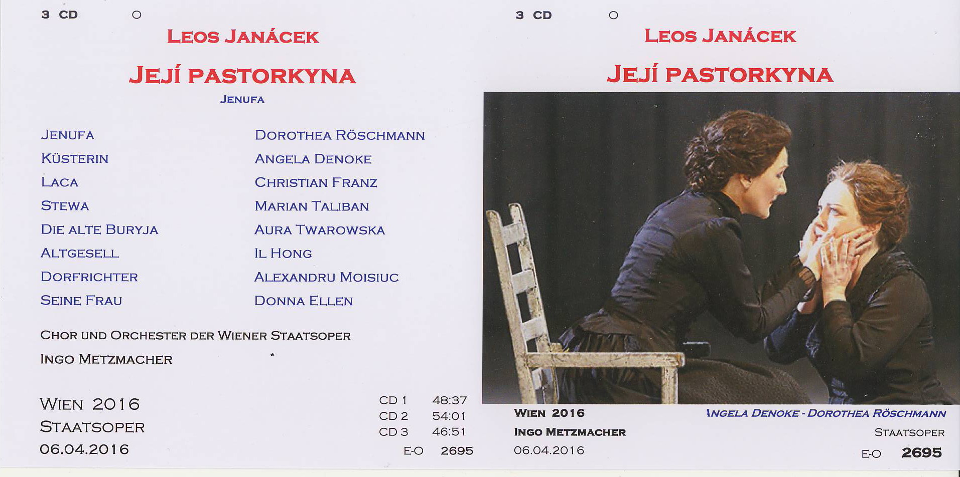 | JEJÍ PASTORKYNA - JENUFA Chor und Orchester der Wiener Staatsoper Cond. Ingo Metzmacher. Cast: Jenufa - Dorothea Röschmann Küsterin - Angela Denoke Laca - Christian Franz Stewa - Marian Taliban Die alte Buryja - Aura Twarowska Altgesell - Il Hong Dorfrichter - Alexandru Moisiuc Seine Frau - Donna Ellen |