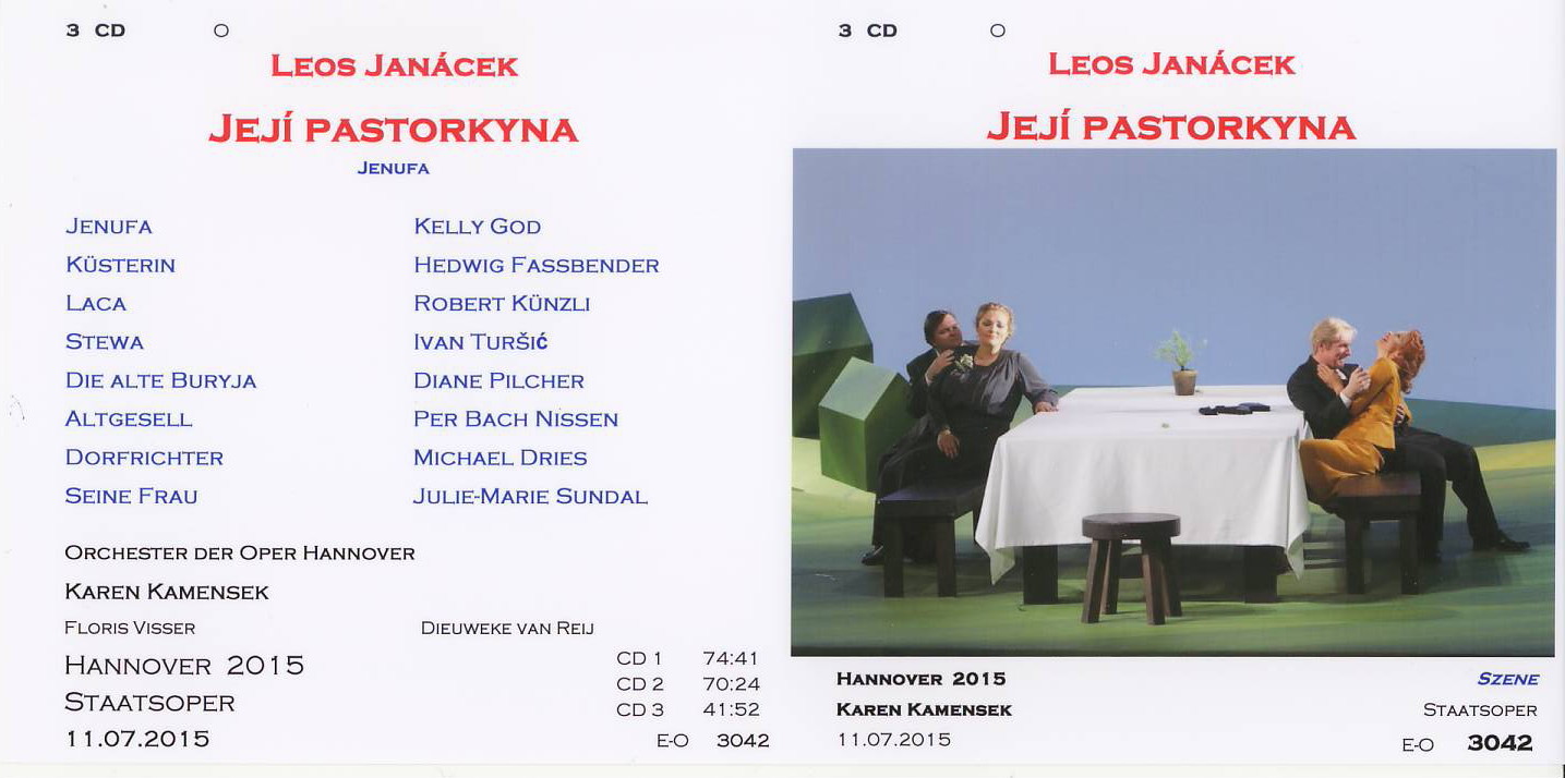 | JEJÍ PASTORKYNA - JENUFA Orchester der Oper Hannover Cond. Karen Kamensek. Cast: Jenufa - Kelly God Küsterin - Hedwig Fassbender Laca - Robert Künzli Stewa - Ivan Tur Die alte Buryja - Diane Pilcher Altgesell - Per Bach Nissen Dorfrichter - Michael Dries Seine Frau - Julie-Marie Sundal |