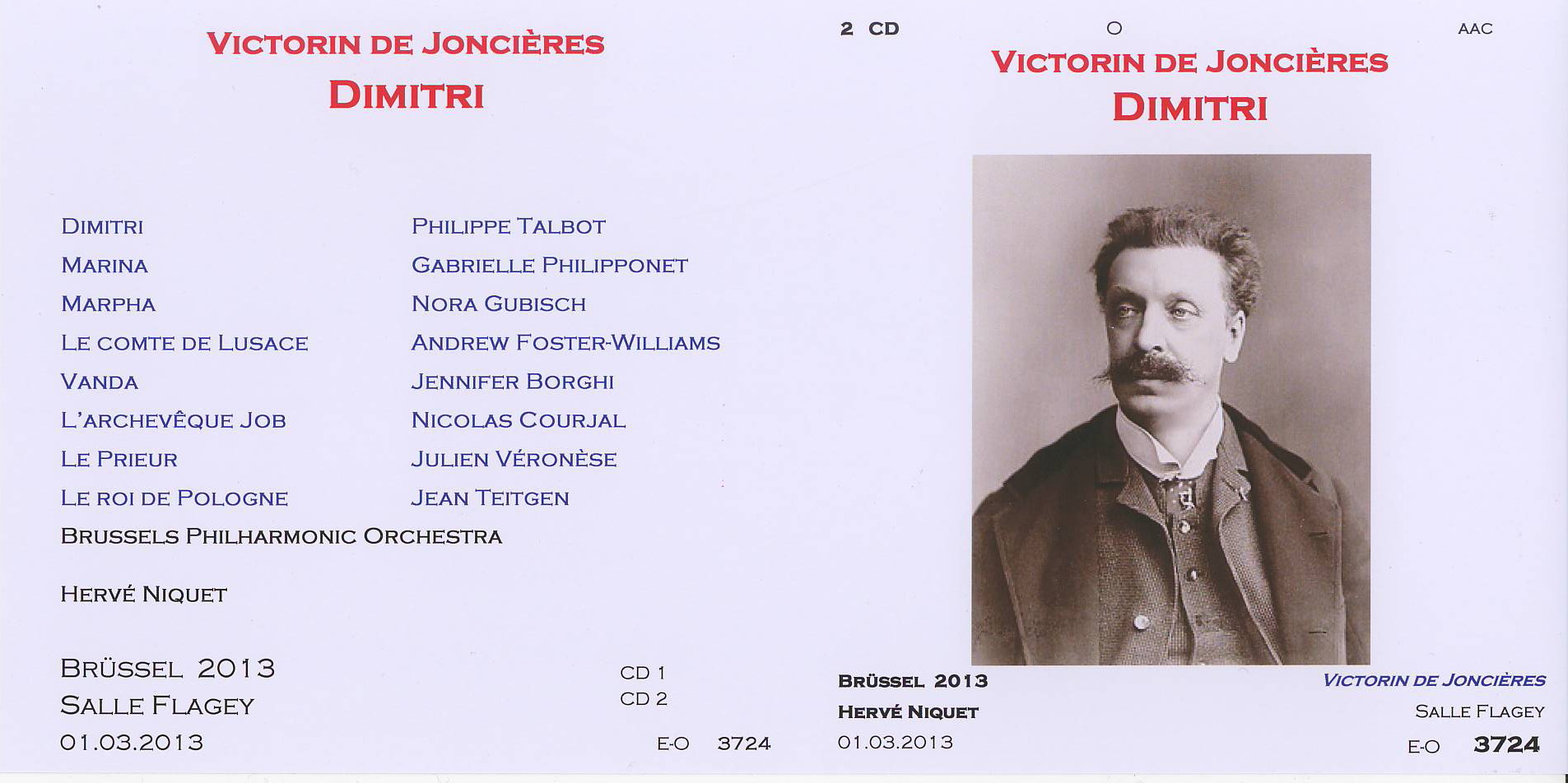 | DIMITRI Brussels Philharmonic Orchestra Cond. Hervé Niquet. Cast: Dimitri - Philippe Talbot Marina - Gabrielle Philipponet Marpha - Nora Gubisch Le comte de Lusace - Andrew Foster-Williams Vanda - Jennifer Borghi L Job - Nicolas Courjal Le Prieur - Julien Véronèse Le roi de Pologne - Jean Teitgen |
