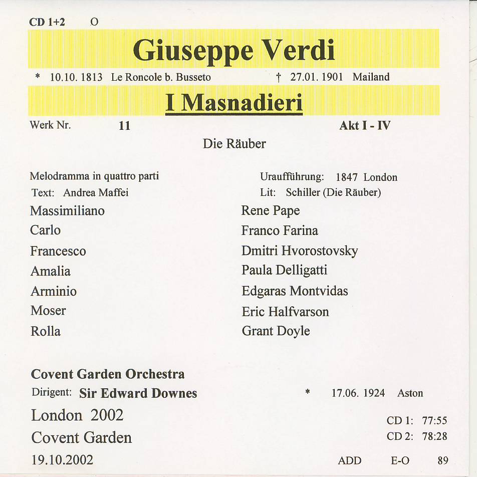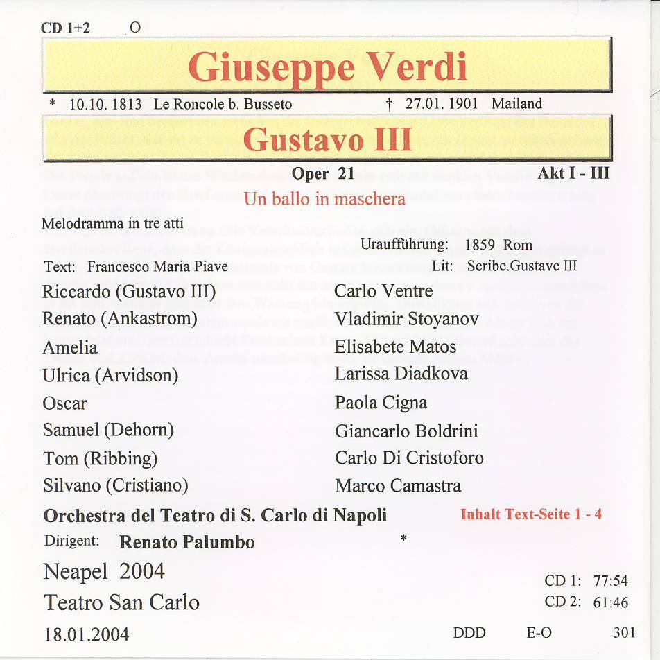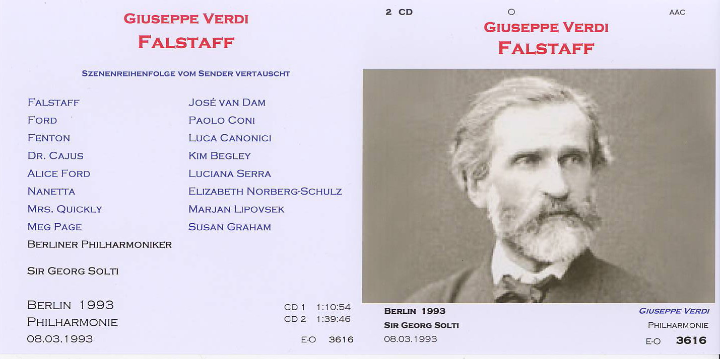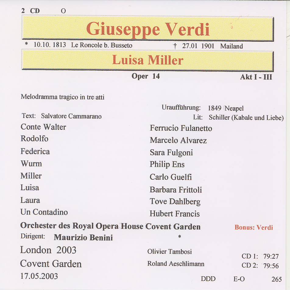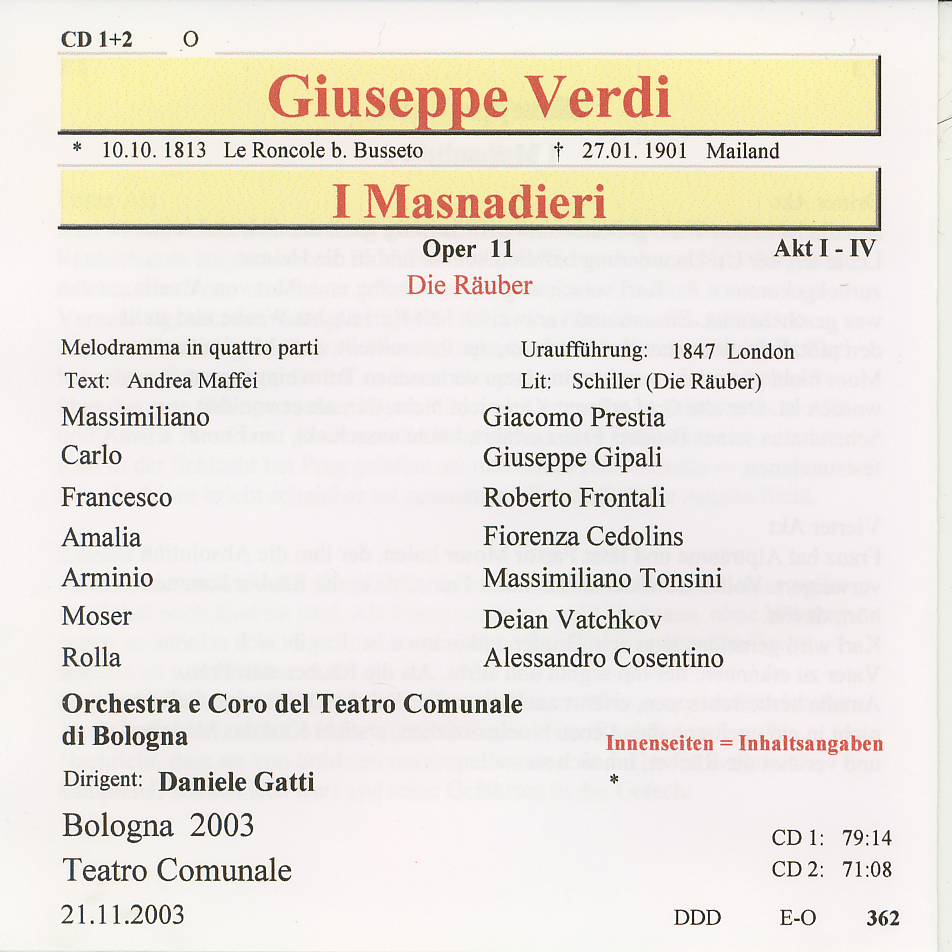 | Dienstag 08. Jänner 2013 00:08 Giuseppe Verdi: "Oberto, Conte di San Bonifacio" Samuel Ramey (Oberto) Maria Guleghina (Leonora) Violeta Urmana (Cuniza) Stuart Neill (Riccardo) Sara Fulgoni (Imelda) London Voices, Academy of St. Martin in the Fields; Dirigent: Sir Neville Marriner (aufgenommen im August 1996 in London) |