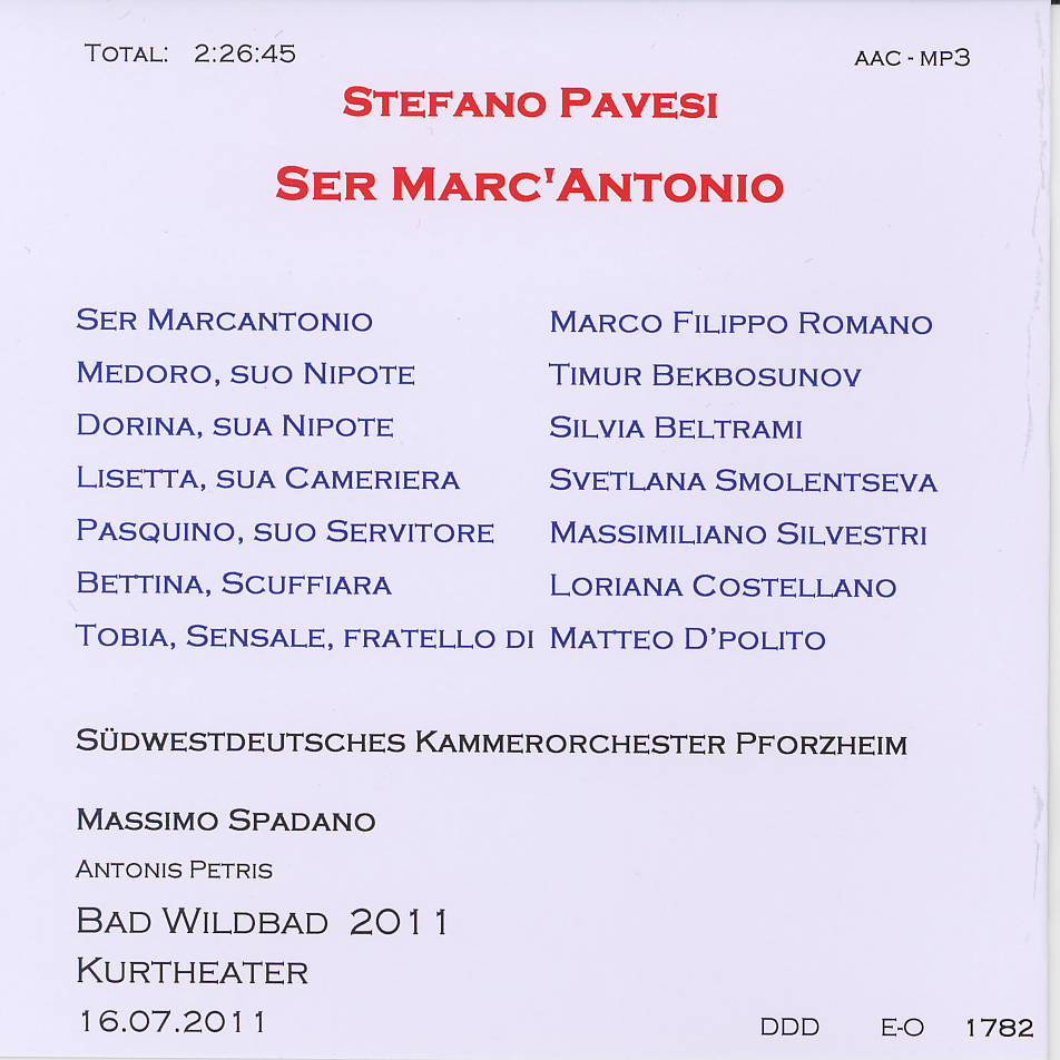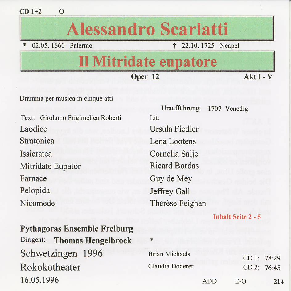 | TITO MANLIU Orchestra Modo Antiquo Cond. Federico Maria Sardelli. Cast: Tito Manlio - Sergio Foresti Manlio - Elisabeth Scholl Servilia - Lucia Sciannimanico Vitellia - Rosa Dominguez Geminio - Davide Livermore Lucio - Nicky Kennedy Decio - Thierry Gregoire Lindo - Bruno Taddia |