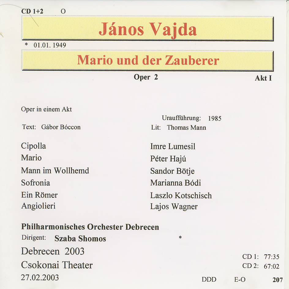 | MARIO UND DER ZAUBERER Philharmonisches Orchester Debrecen Cond. Szaba Shomos. Cast: Cipolla - Imre Lumesil Mario - Péter Hajú Mann im Wollhemd - Sandor Bötje Sofronia - Marianna Bódi Ein Römer - Laszlo Kotschisch Angiolieri - Lajos Wagner - - |