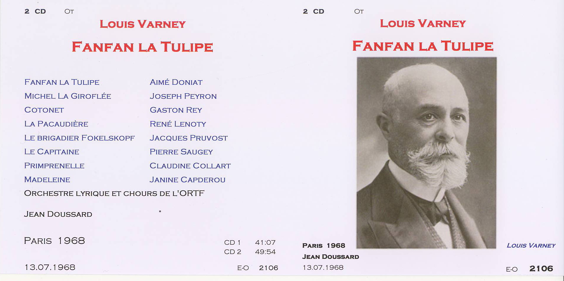 | Broadcast : France Musique, Wednesday 03 October 2007 Louis Varney (1844-1908) : Fanfan-la-Tulipe (1882) Aimé Doniat (baryton) : Fanfan-la-Tulipe Joseph Peyron (tenor) : Michel La Giroflée Gaston Rey (tenor) : Cotonet René Lenoty (tenor) : La Pacaudière Jacques Pruvost.(baryton) : Le brigadier Fokelskopf Pierre Saugey () : Le Capitaine Claudine Collart (soprano) : Primprenelle Janine Capderou (soprano) : Madeleine Lina Dachary (mezzo-soprano) : Florise Monique Stiot (soprano) : Clarisse Linda Felder (soprano) : Brigitte Régine Vallier (soprano) : Charlotte Jacqueline Marié () : Zoé Orchestre lyrique et chours de l'ORTF conductor : Jean Doussard |