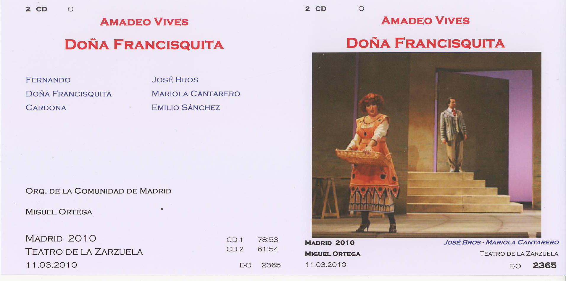 | Temporada del Teatro de La Zarzuela de Madrid. Transmisión directa. (José Iges). VIVES: Doña Francisquita J. Bros (Fernando), M. Cantarero (Doña Francisquita), S. Sánchez Jericó (Cardona) Coro del Teatro de la Zarzuela. Orq. de la Comunidad de Madrid. Dir.: J.R. Encinar. |