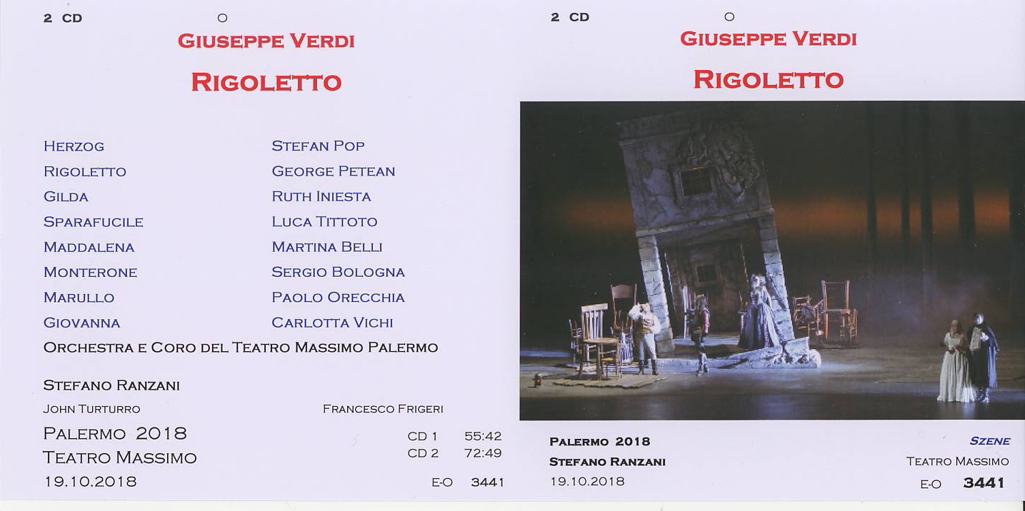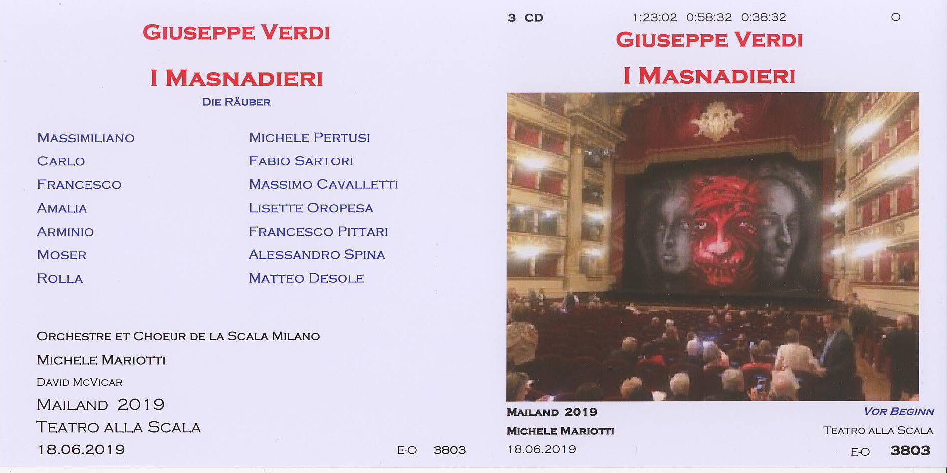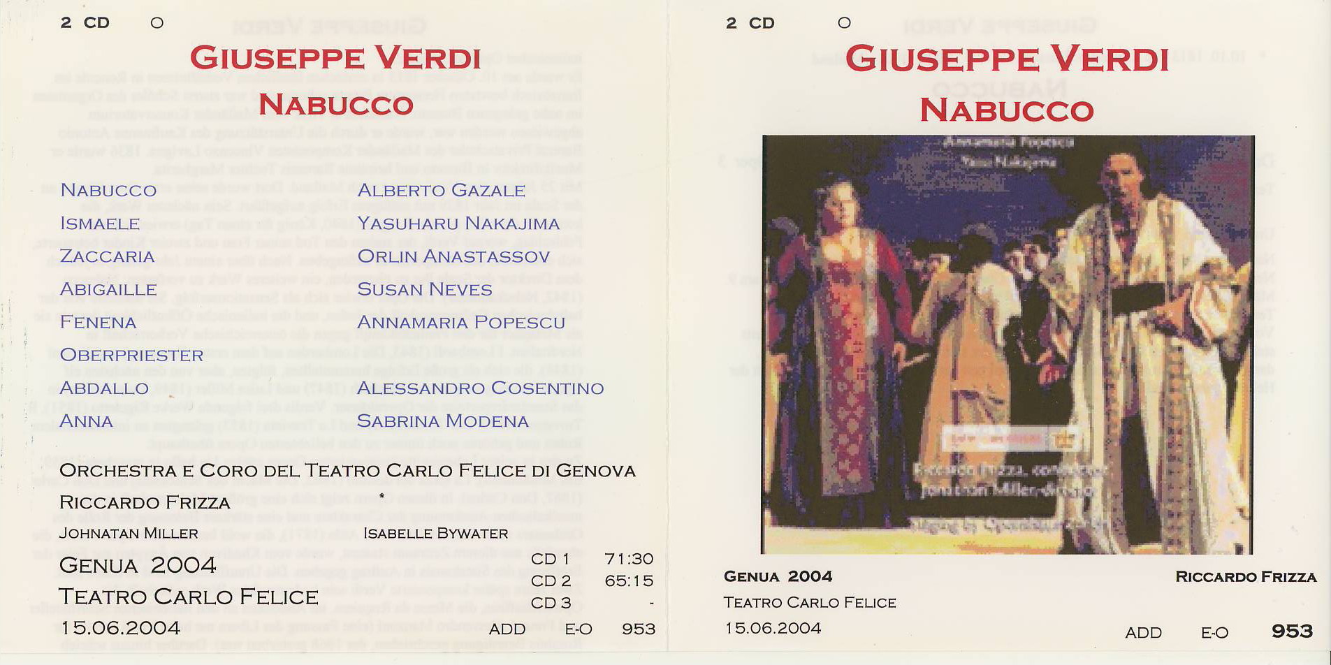 | FESTIVAL DI MACERATA Giuseppe Verdi: Oberto, Conte di San Bonifacio Dramma in zwei Akten; In italiensicher Sprache Oberto ............... Michele Pertusi Riccardo ............. Fabio Sartori Leonora .............. Giovanna de Liso Cuniza ............... Gabriela Colecchia Imelda ............... Antonella dalla Pozza "Vincenzo Bellini" Coro Lirico Marchigiano Orchestra Filarmonica Marchigiana Leitung: Daniele Callegari Aufnahme vom 1. August 1999 |