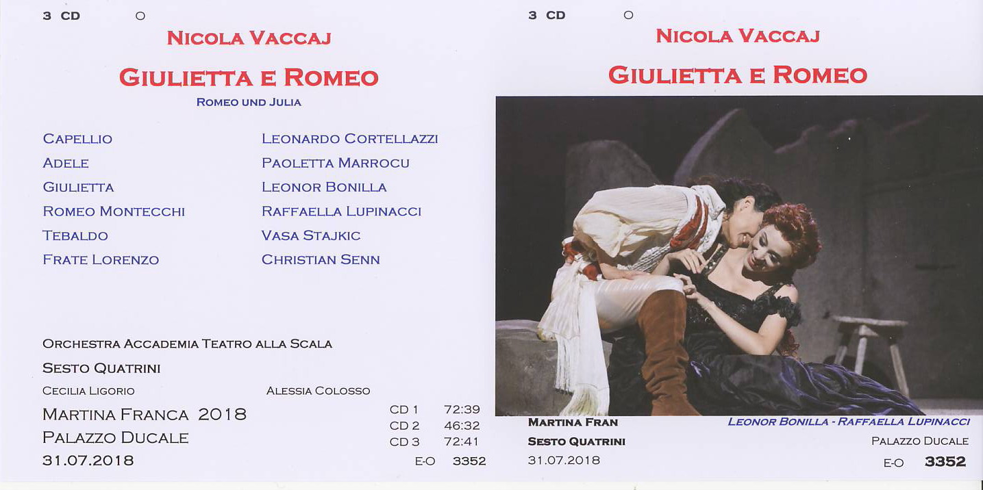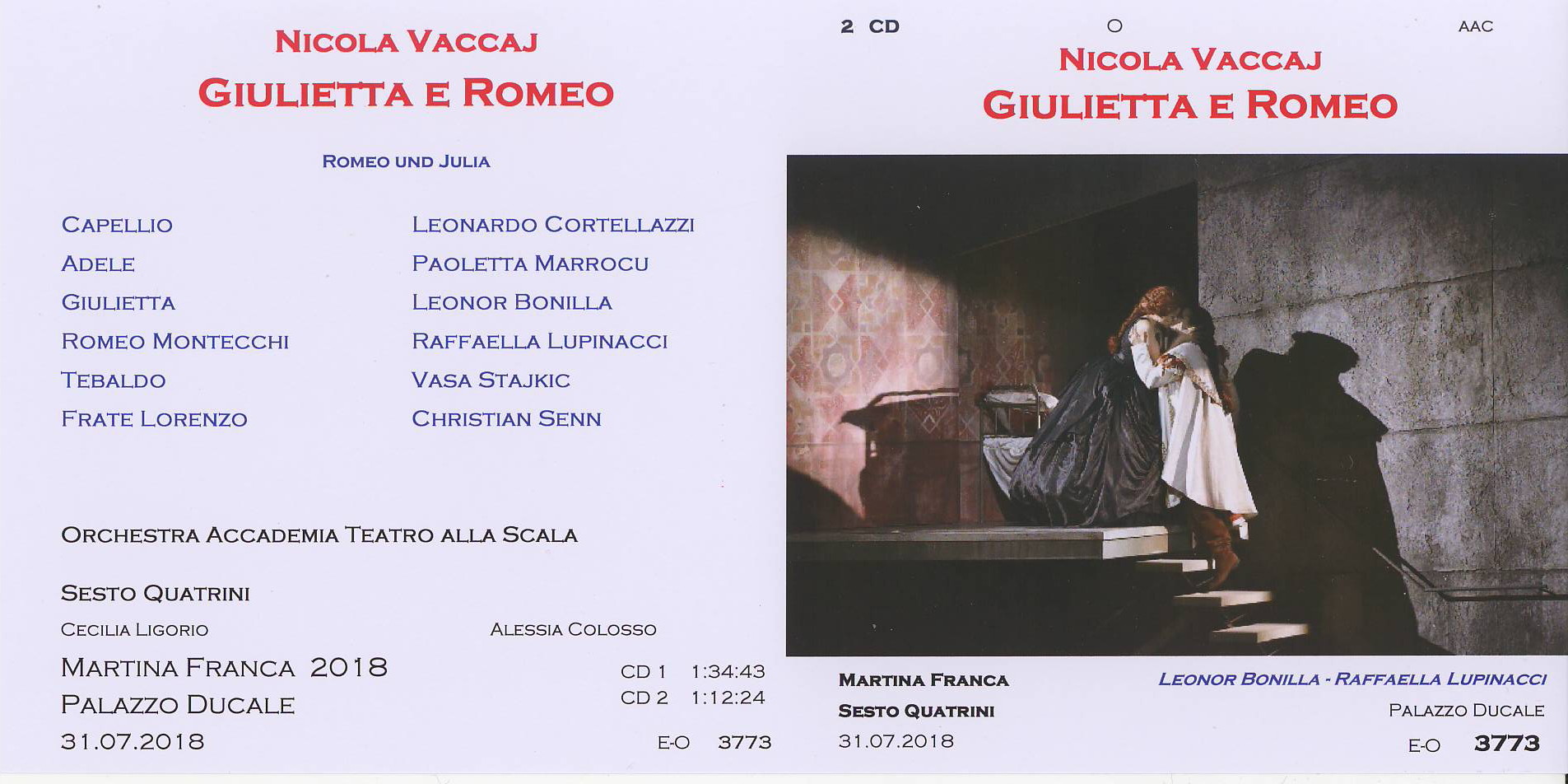 | Nicola Vaccaj: Giulietta e Romeo Capellio: Leonardo Cortellazzi Giulietta: Leonor Bonilla Romeo: Raffaella Lupinacci Adelia: Paoletta Marrocu Tebaldo: Vasa Stajkic Lorenzo: Christian Senn Orchestra Accademia Teatro alla Scala Leitung: Sesto Quatrini Diese Aufnahme entstand im Jahr 2018. CD: Dynamic, CDS7832.02 |
