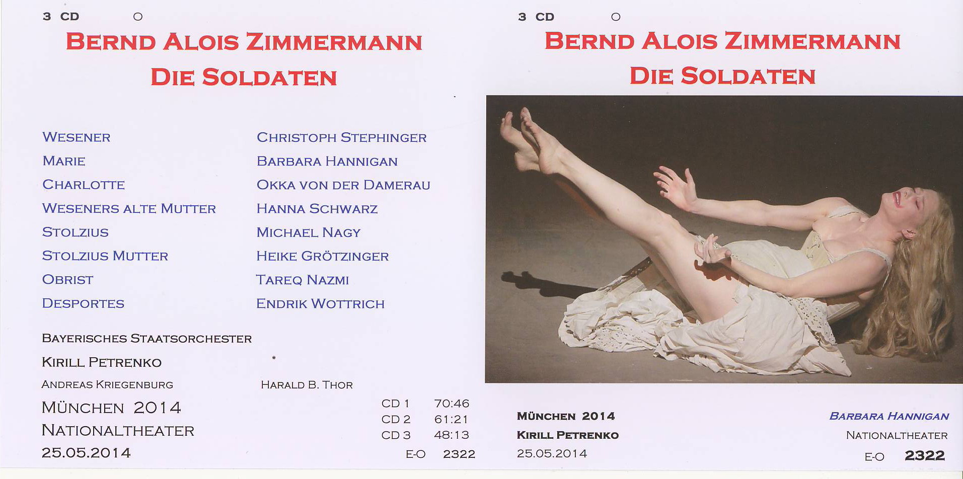 | DIE SOLDATEN Bayerisches Staatsorchester Cond. Kirill Petrenko. Cast: Wesener - Christoph Stephinger Marie - Barbara Hannigan Charlotte - Okka von der Damerau Weseners alte Mutter - Hanna Schwarz Stolzius - Michael Nagy Stolzius Mutter - Heike Grötzinger Obrist - Tareq Nazmi Desportes - Endrik Wottrich |