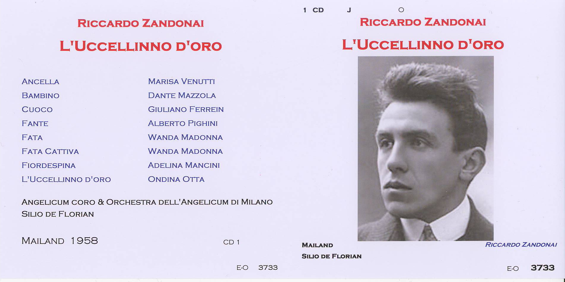 | L'uccellino d'oro (Giovanni Chelodi nach den Brüdern Grimm), fiaba musicale 3 Akte op. 2 (1906/07; 1907 Sacco) - l'ucellino d fiaba musicale in 2 Acts, op.2 (1907) Libretto: Giovanni Chelodi nach den Brüdern Grimm Unpublished. Zandonai's version is for piano and singers only. A performing edition was made by the conductor Silvio de Florian (1908 in 1959. |