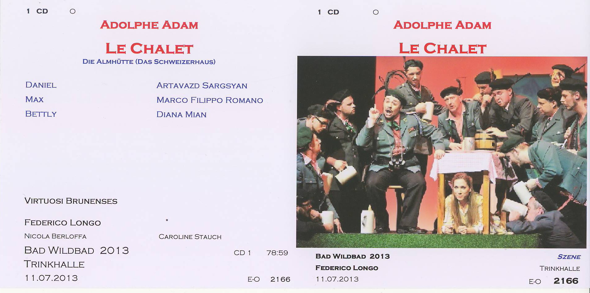 | 19.05 Oper in Wildbad 2013 Belcanto Opera Festival Trinkhalle Wildbad Aufzeichnung vom 11.7.13 Adolphe Adam "Le Chalet" (Die Alphütte), Opéra comique Libretto: Eugène Scribe nach Goethe Daniel, junger Bauer - Artavazd Sargsyan, Tenor Max, ein Schweizer Soldat - Marco Filippo Romano, Bass Bettly, Schwester von Max - Diana Mian, Sopran Soldaten, junge Männer und Frauen im Tal - Bachchor Poznan Virtuosi Brunenses Leitung: Federico Longo 21.00 |