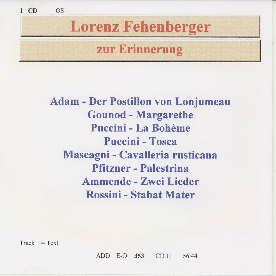 | Der Tenor Lorenz Fehenberger Historische Aufnahmen von 1949 - 1954 Aus Opern von Adolphe Adam ("Der Postillon von Lonjumeau") Charles Gounod ("Faust") Giuseppe Verdi ("Aida") Giacomo Puccini ("La Bohème" - "Tosca") Hans Pfitzner ("Palestrina") Pietro Mascagni ("Cavalleria rusticana") Lieder von Dietrich Ammende; Gioacchino Rossini: "Stabat Mater", Cujus animam gementem |
