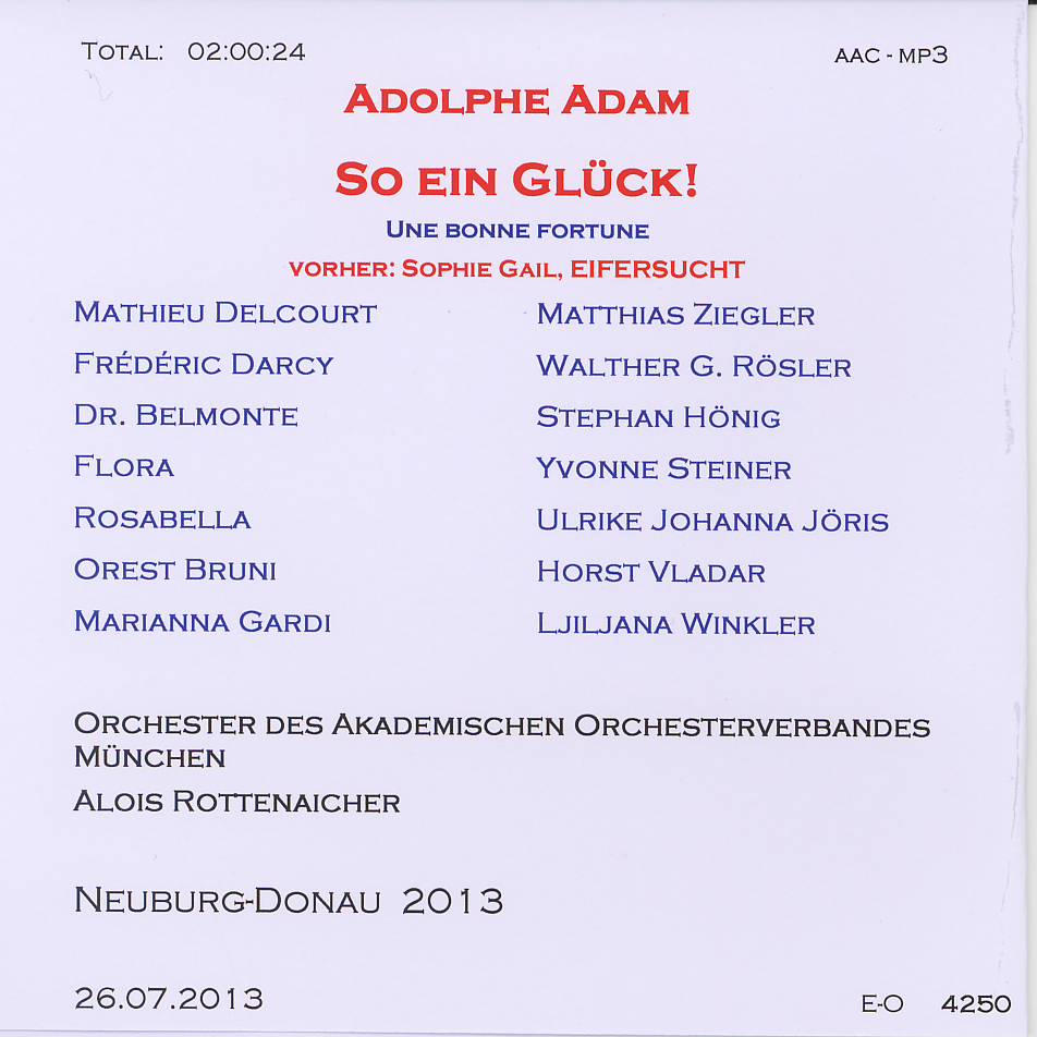 | UNE BONNE FORTUNE Orchester des Akademischen Orchesterverbandes München Cond. Alois Rottenaicher Mathieu Delcourt - Matthias Ziegler Frédéric Darcy - Walther G. Rösler Dr. Belmonte - Stephan Hönig Flora - Yvonne Steiner Rosabella - Ulrike Johanna Jöris Orest Bruni - Horst Vladar Marianna Gardi - Ljiljana Winkler - |