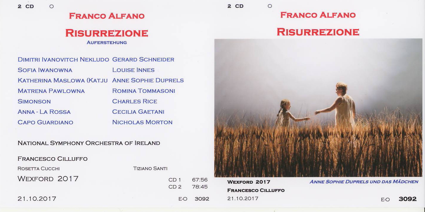 | RISURREZIONE National Symphony Orchestra of Ireland Cond. Francesco Cilluffo Dimitri Ivanovitch Nekludoff - Gerard Schneider Sofia Iwanowna - Louise Innes Katherina Maslowa (Katjuscha) - Anne Sophie Duprels Matrena Pawlowna - Romina Tommasoni Simonson - Charles Rice Anna - La Rossa - Cecilia Gaetani Capo Guardiano - Nicholas Morton - |