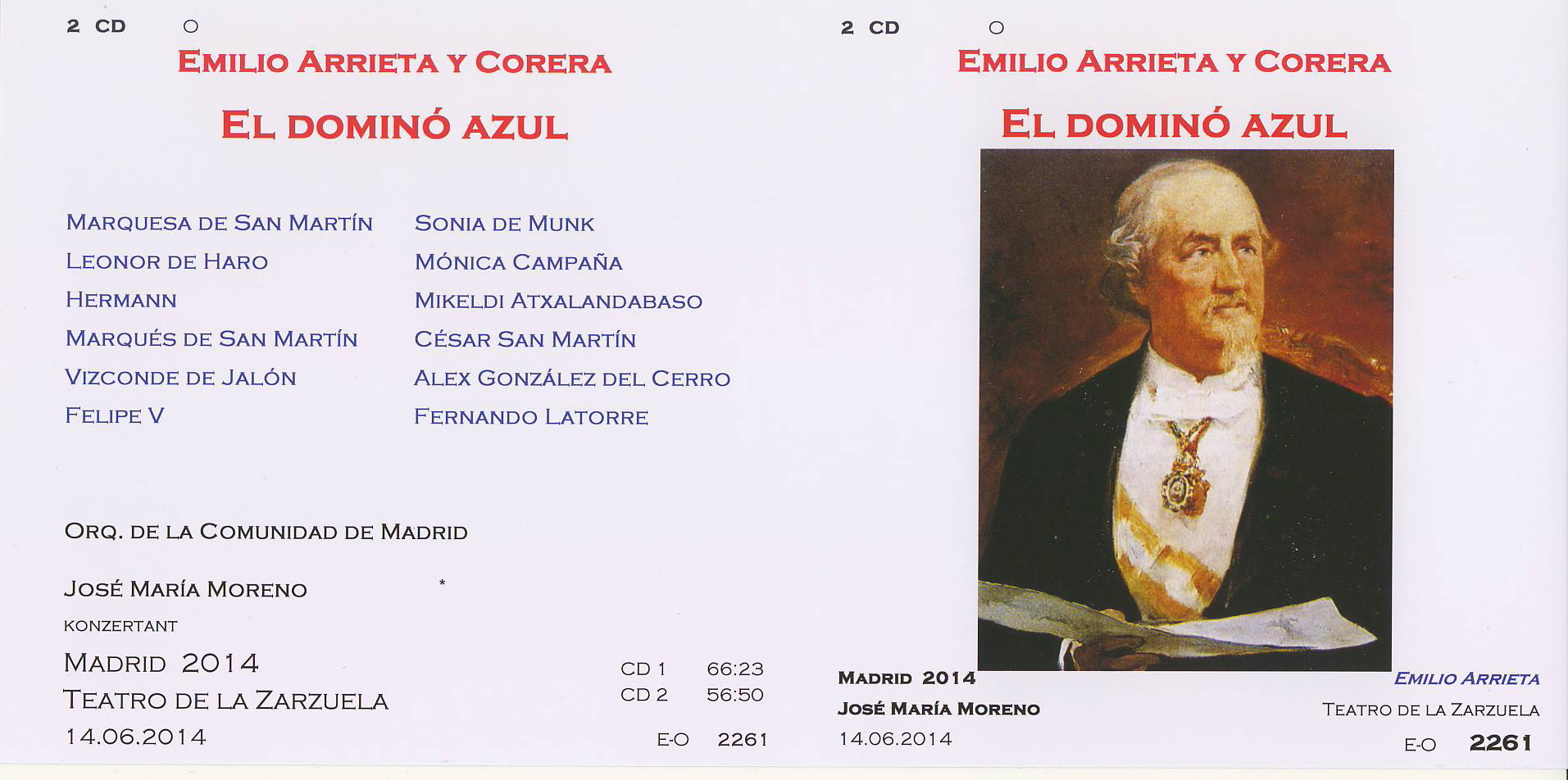 | 20.7. le dimanche 20 juillet 2014 El dominó azul d'Emilio Arrieta par l'Orchestre de la Communauté de Madrid et José-Maria Moreno Le Choeur du Théâtre de la Zarzuela et l'Orchestre de la Communauté de Madrid placés sous la direction de José Maria Moreno interprètent El domino azul d'Emilio Arrieta. Concert donné le 14 juin 2014 au Théâtre de la Zarzuela (Madrid). Présentation : Marcel Quillévéré Emilio Arrieta El dominó azul Zarzuela en trois actes sur un livret de Francisco Comprodon créée le 19 février 1853 au Théâtre le Cirque de Madrid. Sonia de Munk, Soprano, Marquise de San Marin Monica Campana, Mezzo-soprano, Leonor de Haro Mikeldi Atxalandabaso, Ténor, Hermán Fernando Latorre, Basse, Philip IV, Roi d'espagne César San Martin, Baryton, Marquis de San Marin Juanma Cifuentes, Narrateur, Valdivieso Choeur du Théâtre de la Zarzuela Orchestre de la Communauté de Madrid José Maria Moreno, Direction |