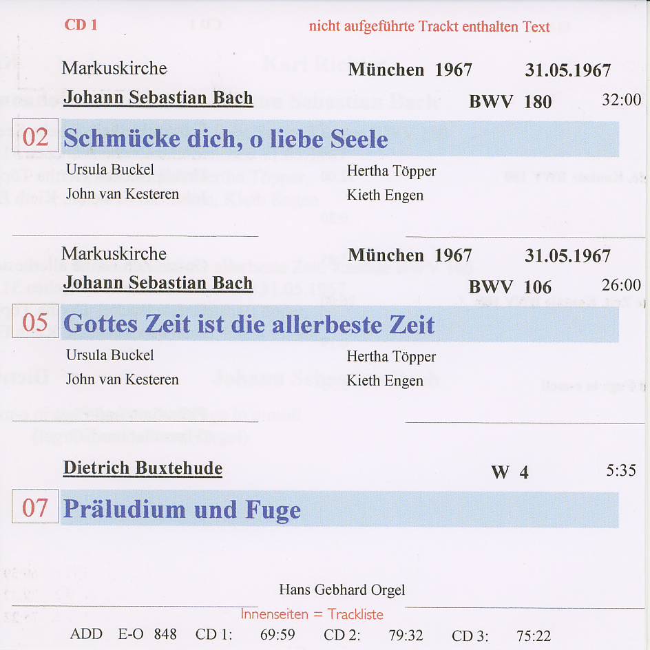 | Internationale Musikfestspiele RBB/MDR/NDR/WDR/SR Lübeck feiert Buxtehude Nikolaus Bruhns Ich liege und schlafe, Kantate; Cantus Cölln, Leitung: Konrad Junghänel Dietrich Buxtehude Gott hilf mir, Kantate; Cantus Cölln, Leitung: Konrad Junghänel Dietrich Buxtehude Auszüge aus dem Kantaten-Zyklus "Membra Jesu nostri"; NDR Chor; Ensemble Sirius Viols, Leitung: Robin Gritton Dietrich Buxtehude Muss der Tod denn auch entbinden, Klaglied aus der Kantate "Fried- und freudenreiche Himmelfahrt"; Andreas Scholl, Countertenor; Concerto di Viola; Basel Consort Dietrich Buxtehude Frohlocket mit Händen, Kantate / Man singet mit Freuden vom Sieg, Kantate; Bettina Pahn und Miriam Meier, Sopran; Patrick van Goethem, Altus; Jörg Dürmüller, Tenor; Klaus Mertens, Bass; Amsterdam Baroque Orchestra and Choir, Leitung: Ton Koopman Aufnahmen des NDR aus St. Jakobi, St. Marien und dem Lübecker Dom |