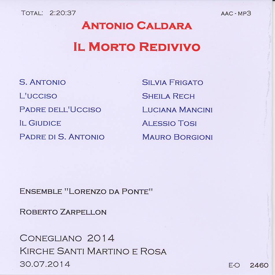 | IL MORTO REDIVIVO Ensemble "Lorenzo da Ponte" Cond. Roberto Zarpellon S. Antonio - Silvia Frigato L'ucciso - Sheila Rech Padre dell'Ucciso - Luciana Mancini Il Giudice - Alessio Tosi Padre di S. Antonio - Mauro Borgioni - - - |