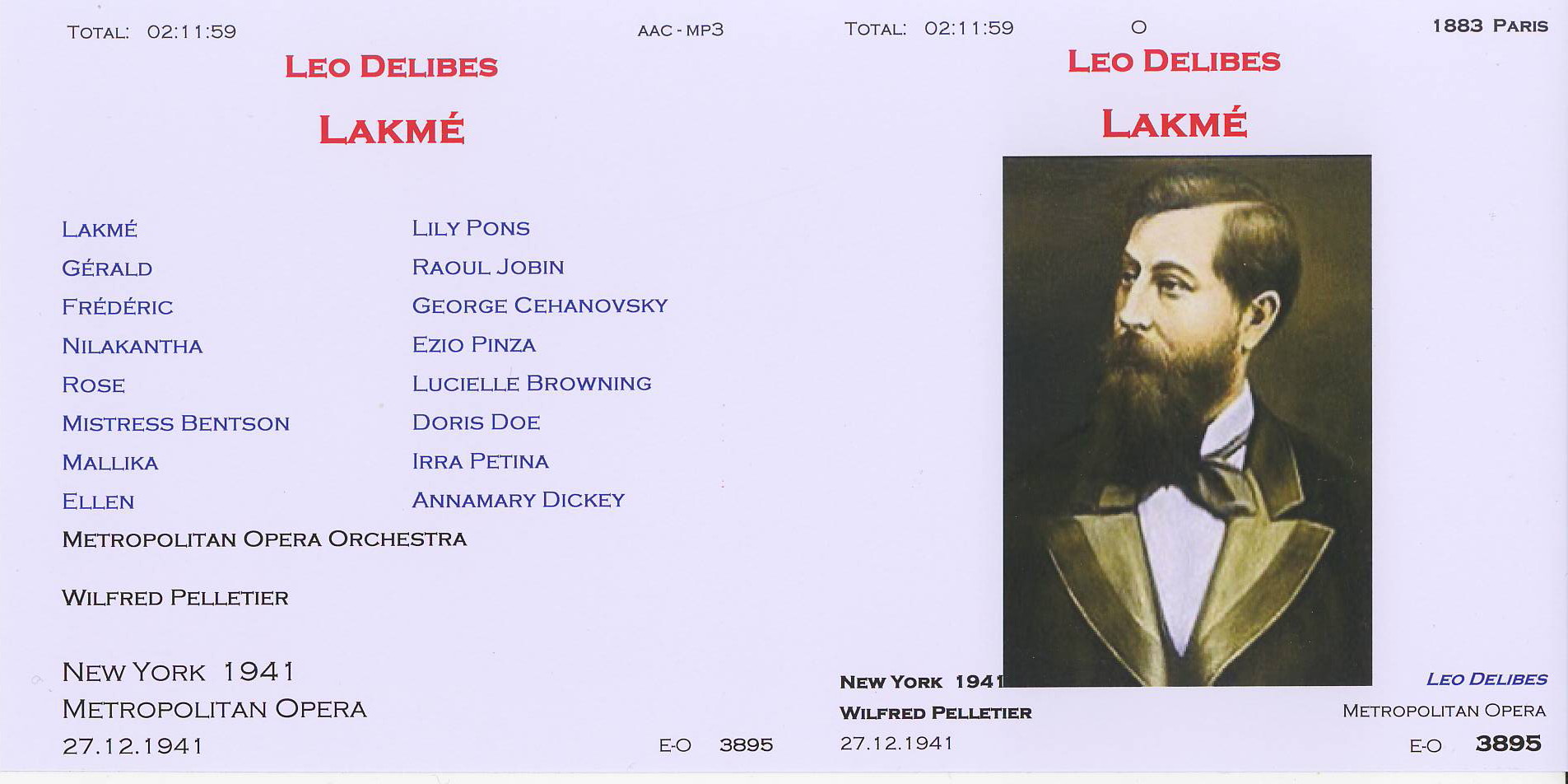 | Delibes - Lakmé - 1941 New York dir Wilfred Pelletier 3895,01 |