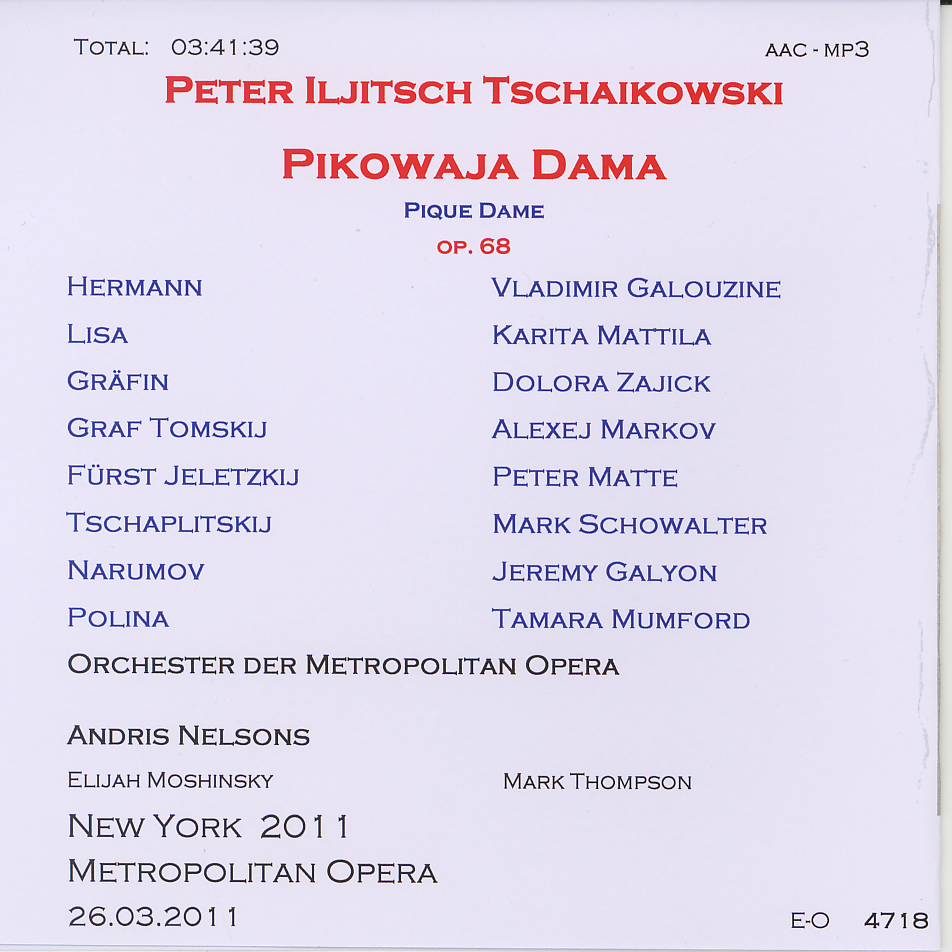 | 03:00 - 05:40 l'opera lirica léo delibes lakmé, opera in 3 atti su libretto di edmond gondinet e philippe gille. prima rappresentazione: parigi, opéra-comique, 14 aprile 1883. atto I 1/1 - 1/15 53'01". atto II 1/16 - 2/8 1h03'34". atto III 2/ 9 - 2/15 32'34" personaggi e interpreti: lakmé: mady mesplé, sopr; gerald: charles burles, ten; nilakantha: roger soyer, bs; mallika: danielle millet, msopr; frédéric: jean-christophe benoit, br; ellen: bernadette antoine, sopr; rose: monique linval, sopr; miss bentson: agnes disney, msopr; hadji: joseph peyron, ten; orch e coro del "theatre national opéra-comique" dir. alain lombard - m° del coro: roger list (reg. 1970) durata: 149.19 emi 7494312 f 2F tr 1 |