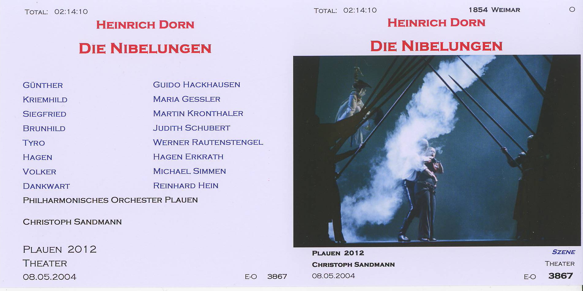 | DIE NIBELUNGEN Philharmonisches Orchester Plauen Cond. Christoph Sandmann Günther - Guido Hackhausen Kriemhild - Maria Gessler Siegfried - Martin Kronthaler Brunhild - Judith Schubert Tyro - Werner Rautenstengel Hagen - Hagen Erkrath Volker - Michael Simmen Dankwart - Reinhard Hein |