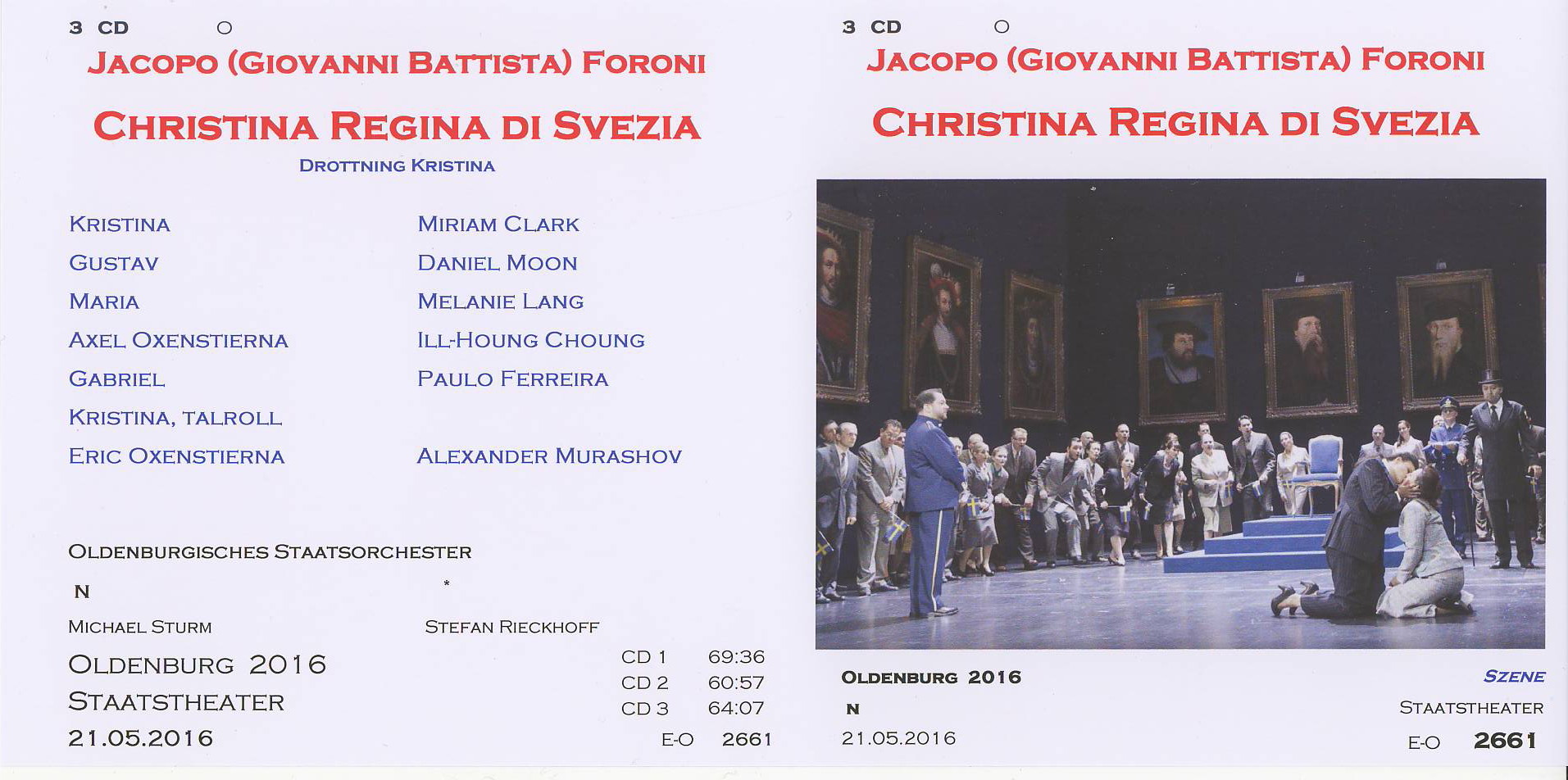| DROTTNING KRISTINA Oldenburgisches Staatsorchester Cond. Vito Cristófaro Kristina - Miriam Clark Gustav - Daniel Moon Maria - Melanie Lang Axel Oxenstierna - Ill-Houng Choung Gabriel - Paulo Ferreira Kristina, talroll - Eric Oxenstierna - Alexander Murashov - |