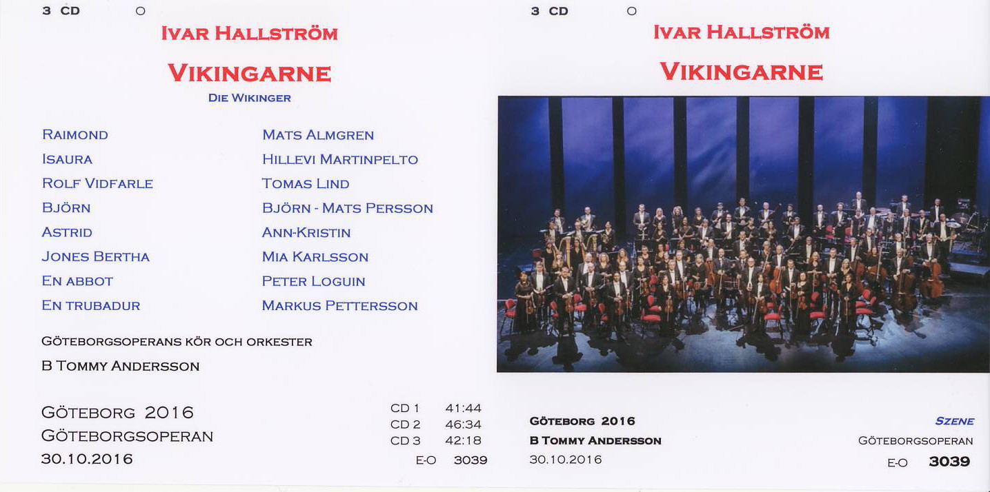| VIKINGARNE Göteborgsoperans kör och orkester Cond. B Tommy Andersson Raimond - Mats Almgren Isaura - Hillevi Martinpelto Rolf Vidfarle - Tomas Lind Björn - Mats Persson Astrid - Ann-Kristin Jones Jones Bertha - Mia Karlsson En abbot - Peter Loguin En trubadur - Markus Pettersson |