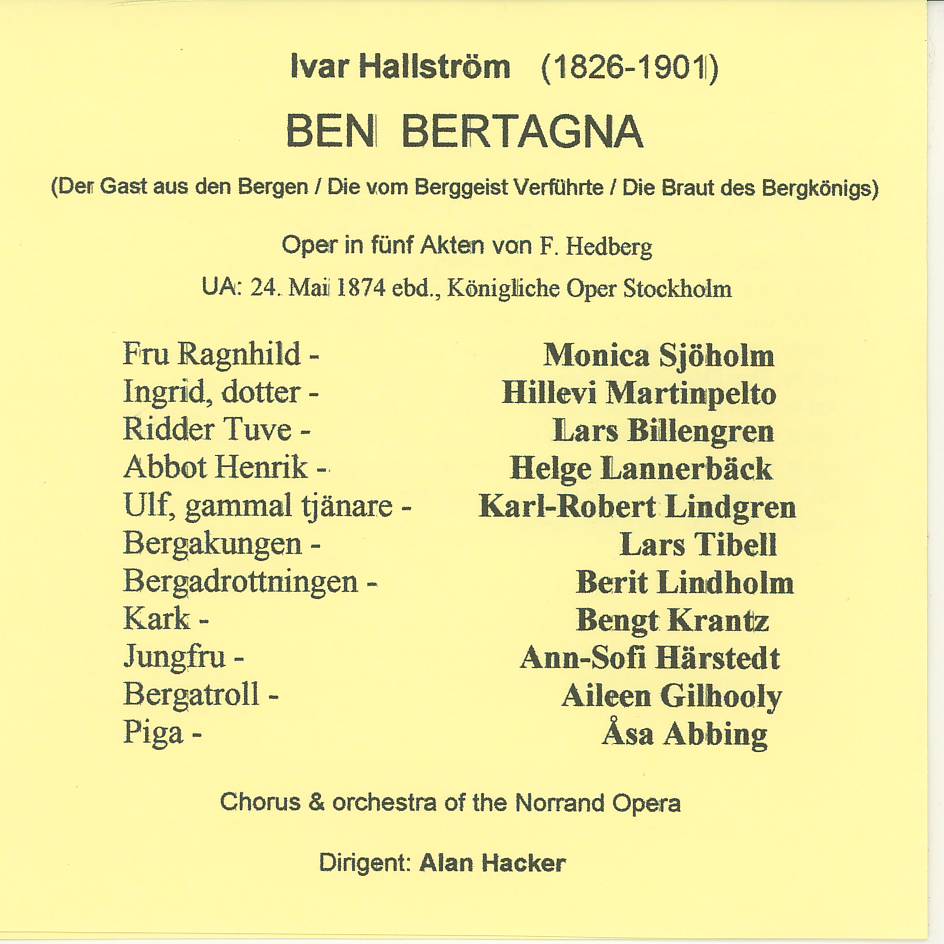 | DEN BERGTAGNA Umea Symphony Orchestra Cond. Alan Hacker Fru Ragnhild - Monica Sjöholm Ingrid - Hillevi Martinpelto Ridder Tuve - Lars Billengren Abbot Hendrik - Helge Lannerbäck Ulf - Karl-Robert Lindgren Bergakungen - Lars Tibell Bergadrottningen - Berit Lindholm Kark - Bengt Krantz |