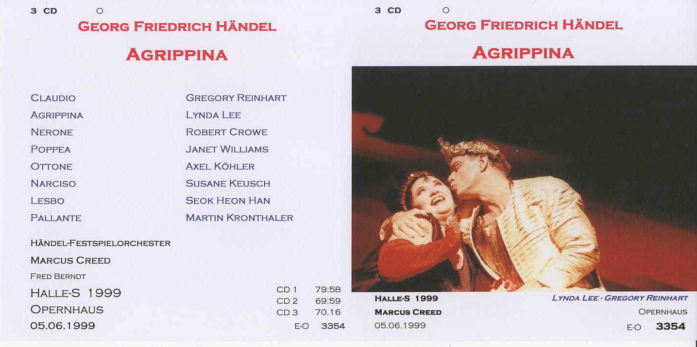 AGRIPPINA Händel-Festspielorchester Cond. Marcus Creed Claudio - Gregory Reinhart Agrippina - Lynda Lee Nerone - Robert Crowe Poppea - Janet Williams Ottone - Axel Köhler Narciso - Susane Keusch Lesbo - Seok Heon Han Pallante - |