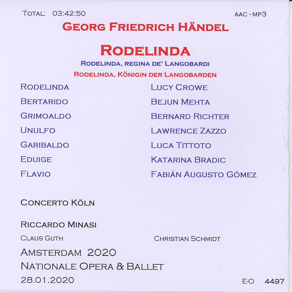 RINALDO Orq. de la Ópera de Flandes Cond. Andreas Spering Rinaldo, ein Ritter - Christine Rice Armida, Königin von Damaskus - Inge Kalna Almirena - Olga Paischnyk Goffredo - Nicola Marchesini Eustazio, Gottfrieds Bruder - Philippe Jaroussky Argante, König von Jerusalem - Robert Gierlach Herald (Aroldo) - Steve Dugardin - |