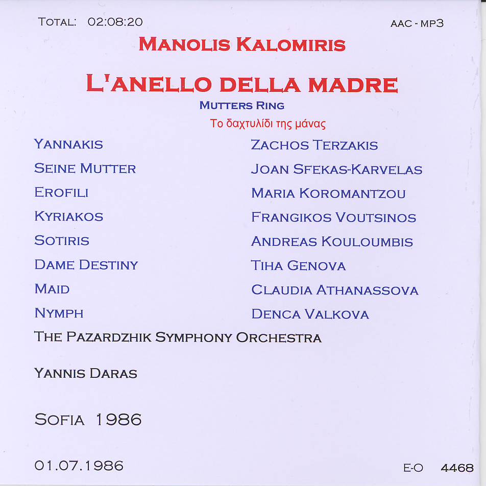 | TO DAKTILIDI TIS MANAS The Pazardzhik Symphony Orchestra Cond. Yannis Daras Yannakis - Zachos Terzakis Seine Mutter - Joan Sfekas-Karvelas Erofili - Maria Koromantzou Kyriakos - Frangikos Voutsinos Sotiris - Andreas Kouloumbis Dame Destiny - Tiha Genova Maid - Claudia Athanassova Nymph - Denca Valkova |