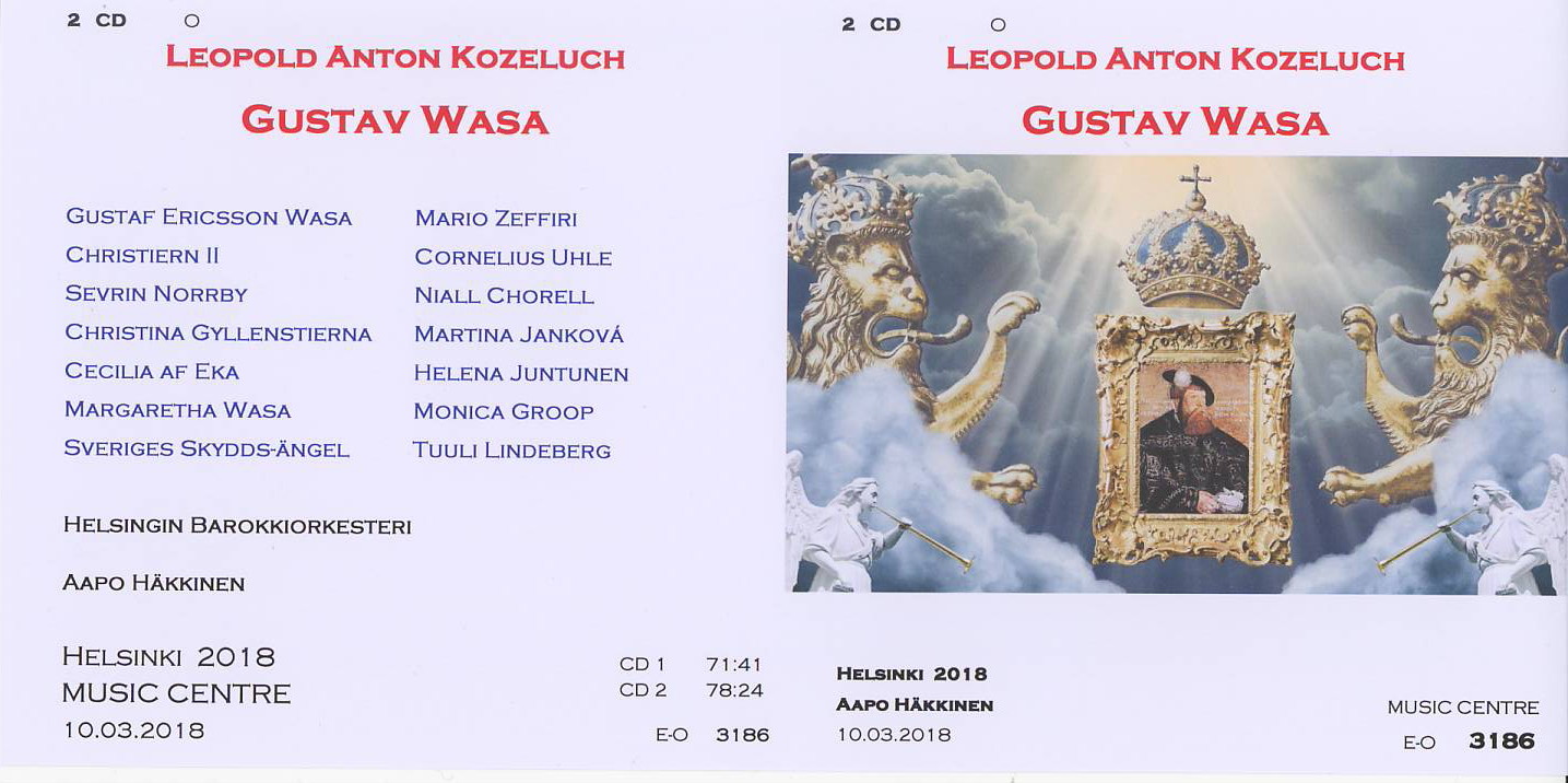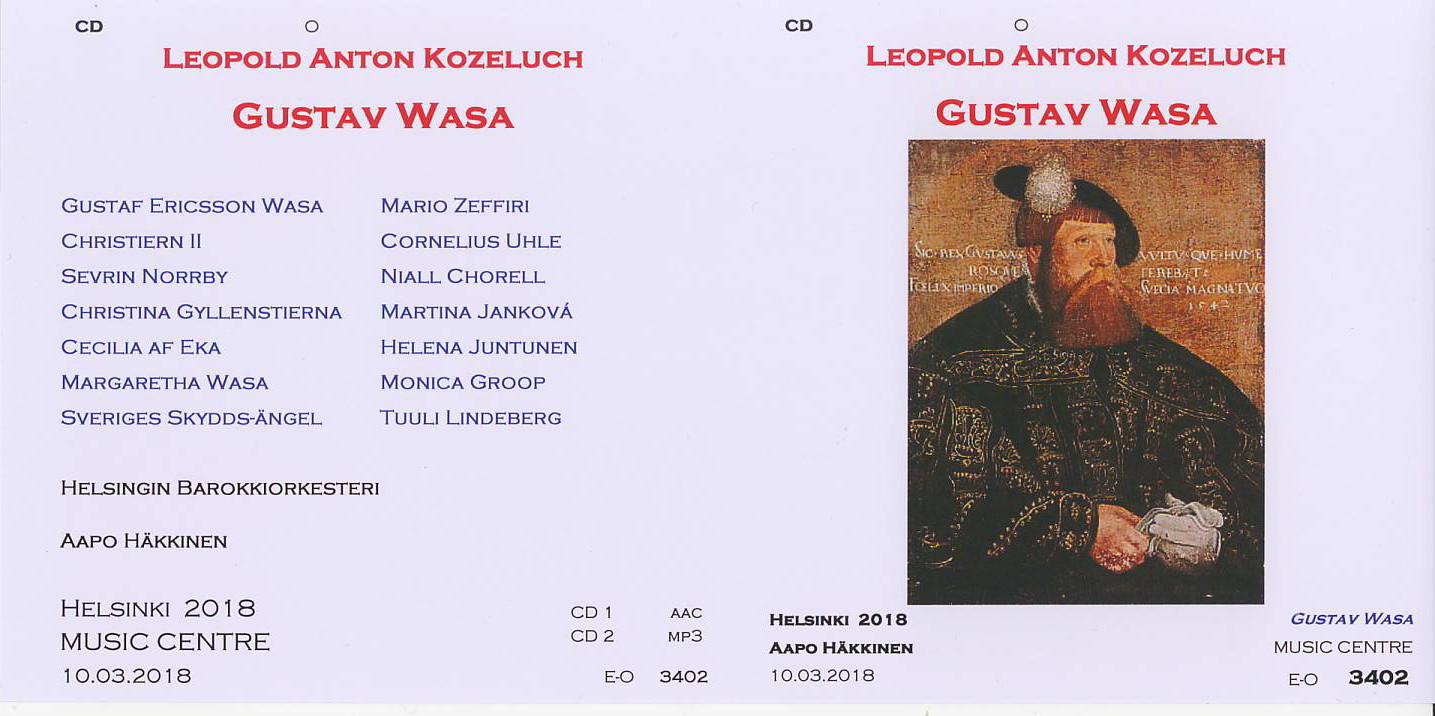 | GUSTAV WASA Helsingin Barokkiorkesteri Cond. Aapo Häkkinen Gustaf Ericsson Wasa - Mario Zeffiri Christiern II - Cornelius Uhle Sevrin Norrby - Niall Chorell Christina Gyllenstierna - Martina Janková Cecilia af Eka - Helena Juntunen Margaretha Wasa - Monica Groop Sveriges Skydds-ängel - Tuuli Lindeberg - |