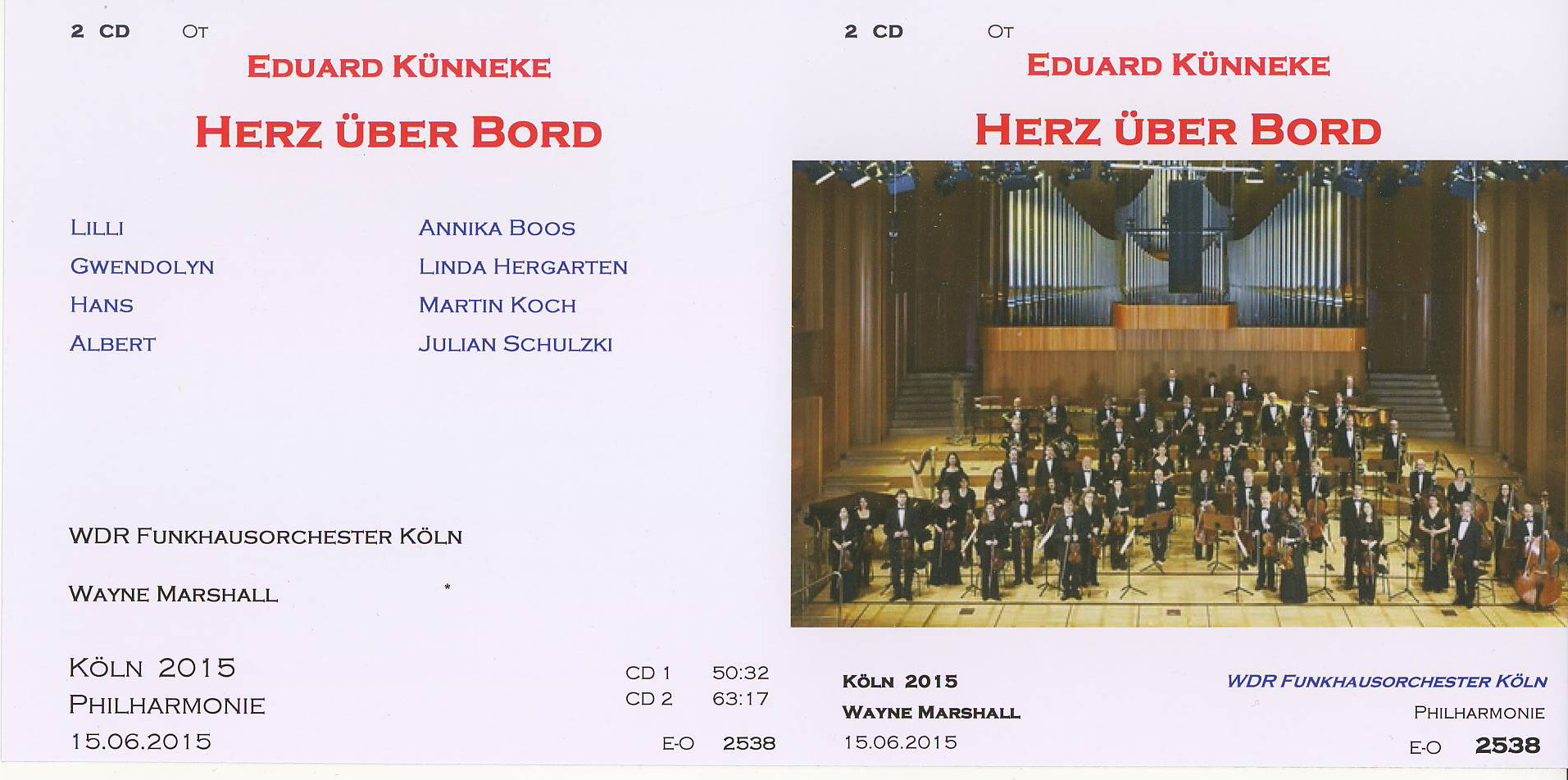 | HERZ ÜBER BORD WDR Funkhausorchester Köln Cond. Wayne Marshall Lilli - Annika Boos Gwendolyn - Linda Hergarten Hans - Martin Koch Albert - Julian Schulzki - - - - |