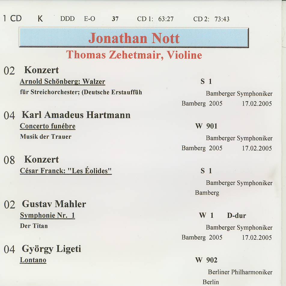 | Konzert der Bamberger Symphoniker F Leitung: Jonathan Nott Solist: Pierre-Laurent Aimard, Klavier György Ligeti: "Atmosphères"; Ludwig van Beethoven: Klavierkonzert Nr. 4 G-dur; György Ligeti: Études pour Piano; Gustav Mahler: "Totenfeier"; Ludwig van Beethoven: "Leonoren-Ouvertüre Nr. 3" Aufnahme vom 27. April 2005 in der Konzert- und Kongresshalle Bamberg |