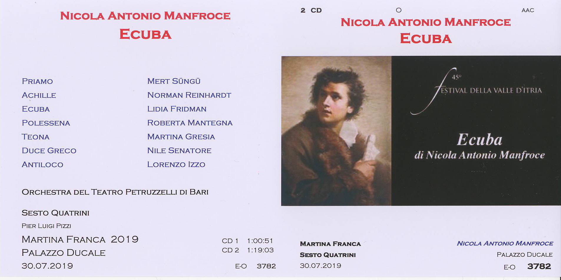 | ECUBA Orchestra del Teatro Petruzzelli di Bari Cond. Priamo - Mert Süngü Achille - Norman Reinhardt Ecuba - Lidia Fridman Polessena - Roberta Mantegna Teona - Martina Gresia Duce Greco - Nile Senatore Antiloco - Lorenzo Izzo - |