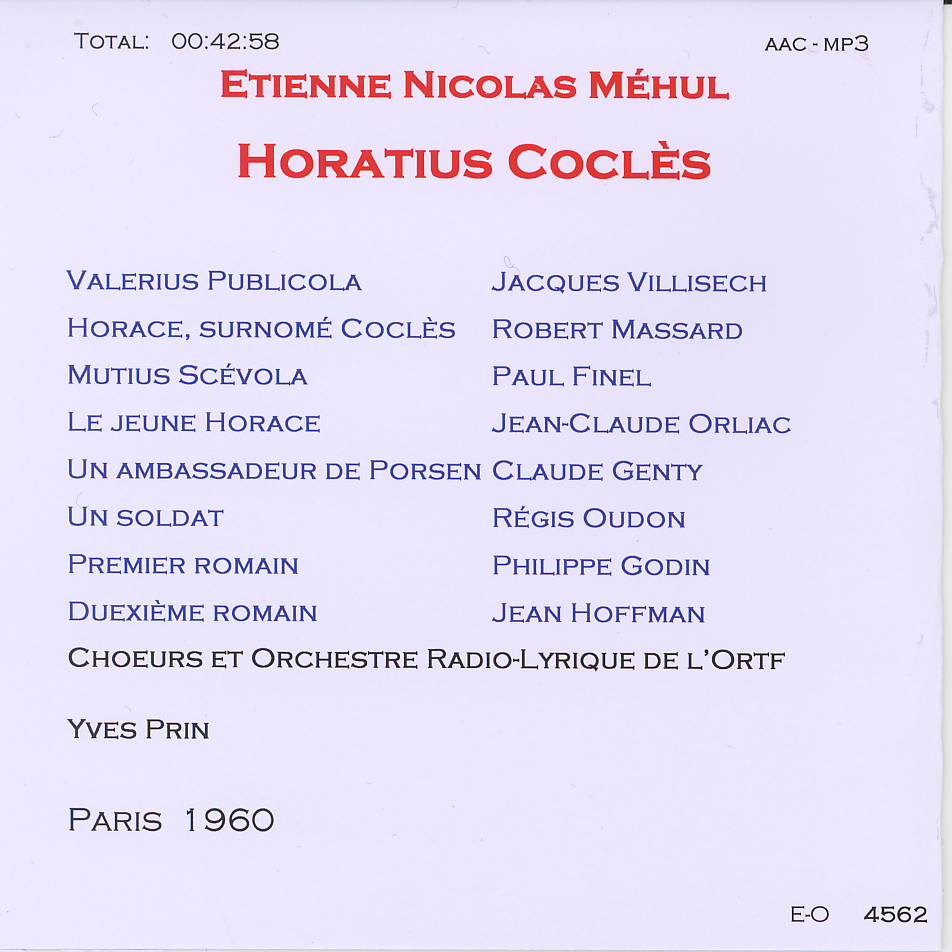 | HORATIUS COCLÈS Choeurs et Orchestre Radio-Lyrique de l Cond. Yves Prin Valerius Publicola - Jacques Villisech Horace, surnomé Coclès - Robert Massard Mutius Scévola - Paul Finel Le jeune Horace - Jean-Claude Orliac Un ambassadeur de Porsenna - Claude Genty Un soldat - Régis Oudon Premier romain - Philippe Godin Duexième romain - Jean Hoffman |