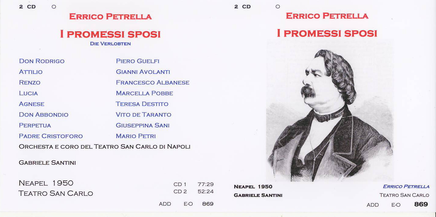 | I PROMESSI SPOSI Orchesta e coro del Teatro San Carlo di Napoli Cond. Gabriele Santini Don Rodrigo - Piero Guelfi Attilio - Gianni Avolanti Renzo - Francesco Albanese Lucia - Marcella Pobbe Agnese - Teresa Destito Don Abbondio - Vito de Taranto Perpetua - Giuseppina Sani Padre Cristoforo - Mario Petri |