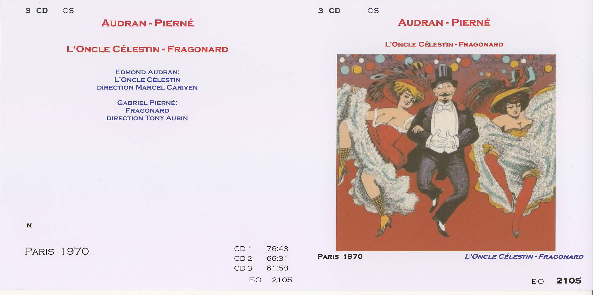 | samedi 3 juillet 2010 L'Oncle Célestin de Edmond Audran et Fragonard de Gabriel Pierné par Benoît Duteurtre Edmond Audran : L'Oncle Célestin Claudine Collart, Marcelle Sansonetti, Deva Dassy, Renée Castille, Henri Bedex, Aimé Doniat, Léo Bardollet, Gaston Rey Orchestre Radio Lyrique, Marcel Cariven Enregistrement du 16 juillet 1960 Gabriel Pierné : Fragonard - Jacques Jansen, Robert Massard, Gaston Rey, Marcel Enot, René Lenoty, Joseph Peyron, Fanely Revoil, Claudine Collart, Madeleine Drouot, Jacqueline Cauchard Orchestre Radio Lyrique, Tony Aubin Enregistrement du 9 février 1957 |