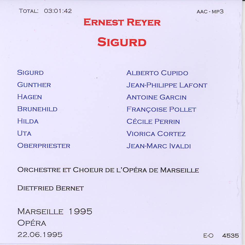 | SIGURD Orchestre et Choeur de l de Marseille Cond. Dietfried Bernet Sigurd - Alberto Cupido Gunther - Jean-Philippe Lafont Hagen - Antoine Garcin Brunehild - Françoise Pollet Hilda - Cécile Perrin Uta - Viorica Cortez Oberpriester - Jean-Marc Ivaldi - |