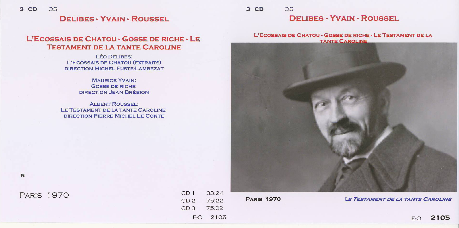 | 10 juillet L'Ecossais de Chatou de Léo Delibes; Gosse de Riche de Maurice Yvain et Le Testament de la tante Caroline de A. Roussel par Benoît Duteurtre Léo Delibes: L'Ecossais de Chatou (extraits) Denise Boursin, Monique Stiot, Maurice Delaunay, Aimé Doniat, Robert Andreozzi Orchestre lyrique de l'ORTF, Jean Doussard Enregistrement du 30 janvier 1970 Maurice Yvain: Gosse de riche Linda Felder, Denise Benoit, Germaine Duclos, Monique Stiot, Dominique Tirmont, Aimé Doniat, Joseph Peyron Orchestre lyrique de l'ORTF, Jean Brébion Enregistrement du 19 octobre 1970. Albert Roussel: Le Testament de la tante Caroline Lina Dachary, Denise Benoit, Monique Linval, Christiane Gayraud, Bernard Plantey, Gaston Rey, Lucien Lovano, Bernard Demigny, Orchestre Radio Lyrique, Pierre Michel Le Conte Enregistrement du 10 décembre 1966 |