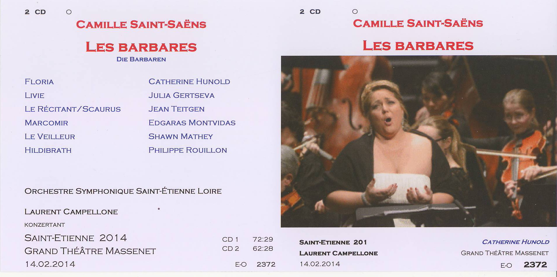 | Camille Saint-Saëns Les Barbares 14c, 16mc Feb 2014 Saint-Etienne Auf Französisch mit Übertiteln auf Französisch Tragédie lyrique in 3 acts (Académie nationale de Musique, Paris; 1901) Libretto: Victorien Sardou, Pierre-Barthélemy Gheusi Saint-Etienne, Grand Théâtre Massenet Dirigent - Laurent Campellone Chorleitung - Laurent Touche ~ Floria - Catherine Hunold Livie - Julia Gertseva Le Récitant/Scaurus - Jean Teitgen Marcomir - Edgaras Montvidas Le Veilleur - Shawn Mathey Hildibrath - Philippe Rouillon |