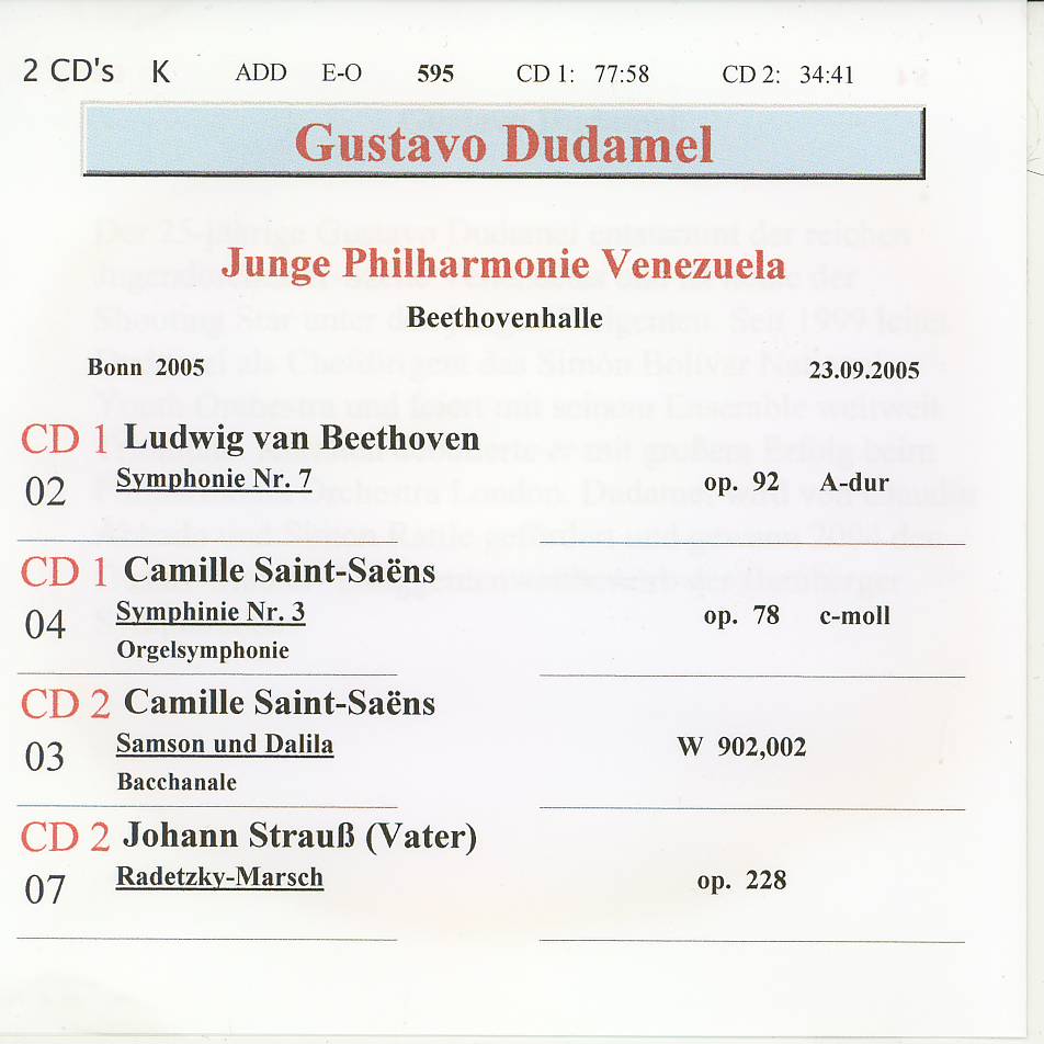 | Beethovenfest Bonn 2005 Ludwig van Beethoven Sinfonie Nr. 7 A-dur, op. 92 Camille Saint-Saëns Sinfonie Nr. 3 c-moll, op. 78 Werke lateinamerikanischer Komponisten Junge Philharmonie Venezuela, Leitung: Gustavo Dudamel Moderation: Christian Schruff Aufnahme vom 23. September aus der Beethovenhalle |