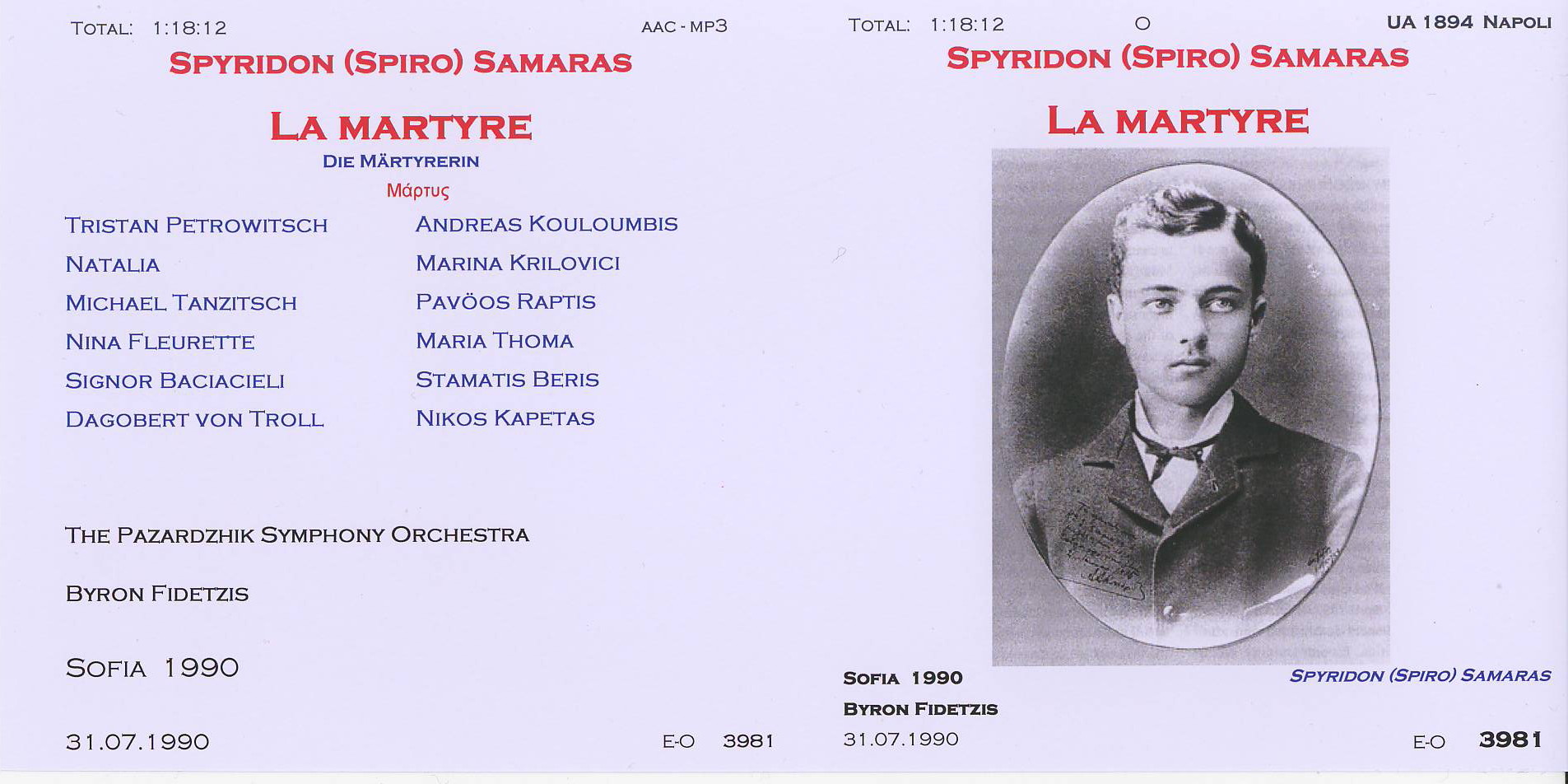 | LA MARTYRE The Pazardzhik Symphony Orchestra Cond. Byron Fidetzis Tristan Petrowitsch - Andreas Kouloumbis Natalia - Marina Krilovici Michael Tanzitsch - Pavöos Raptis Nina Fleurette - Maria Thoma Signor Baciacieli - Stamatis Beris Dagobert von Troll - Nikos Kapetas - - |