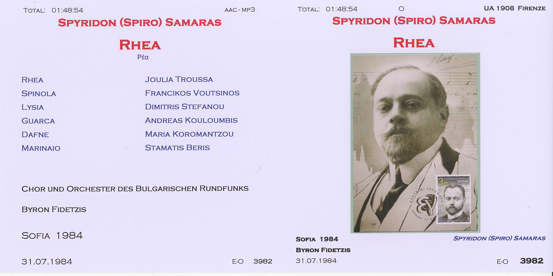 | RHEA Chor und Orchester des Bulgarischen Rundfunks Cond. Byron Fidetzis Rhea - Joulia Troussa Spinola - Francikos Voutsinos Lysia - Dimitris Stefanou Guarca - Andreas Kouloumbis Dafne - Maria Koromantzou Marinaio - Stamatis Beris - - |